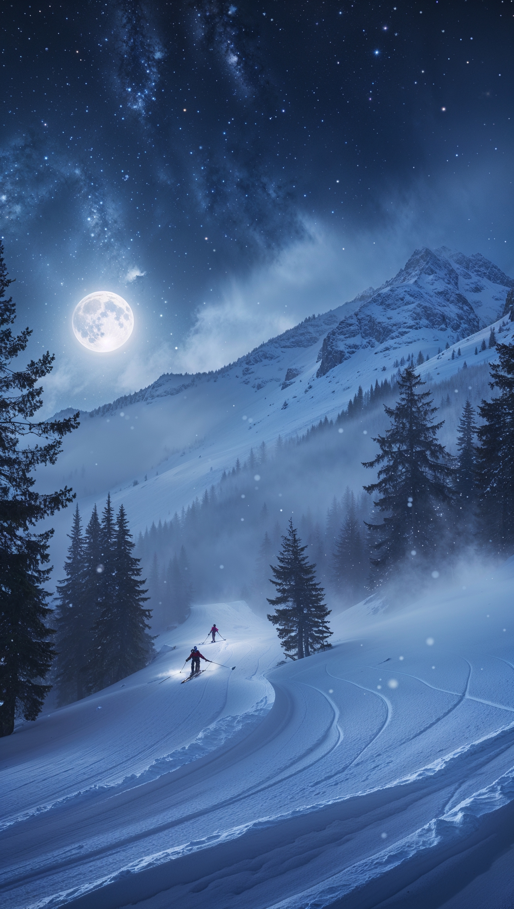 1664x2944 Winter galaxy sky over ski slopes, cosmic fantasy style