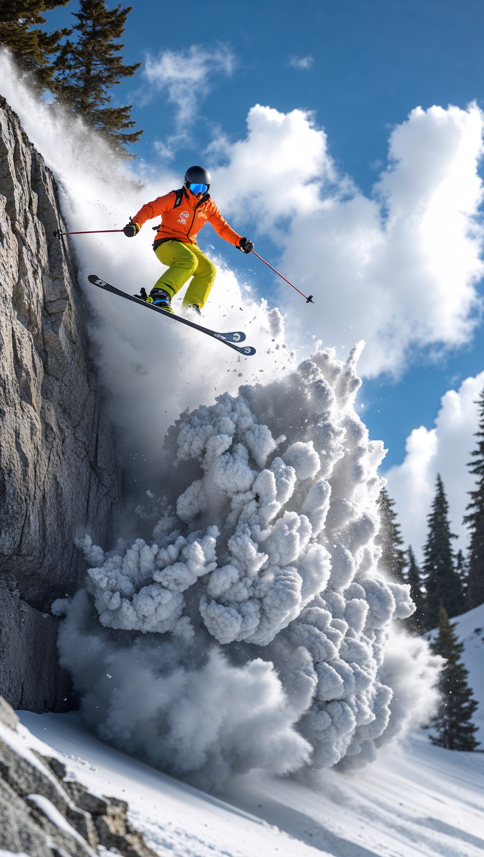 1664x2944 A skier going off a cliff, dramatic snow explosion