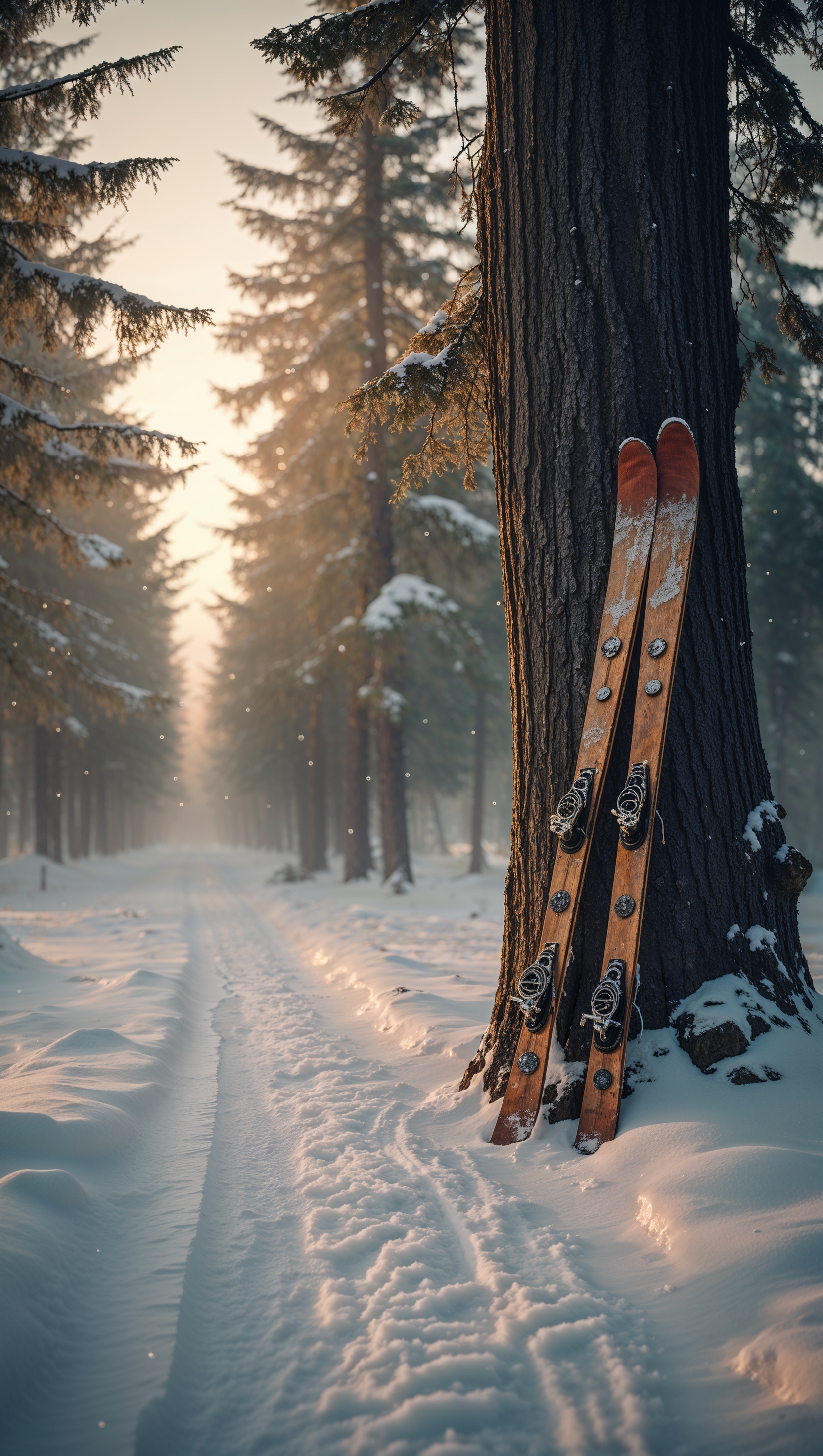 1664x2944 Snowy landscape with ski poles and a thermos, cozy winter vibe