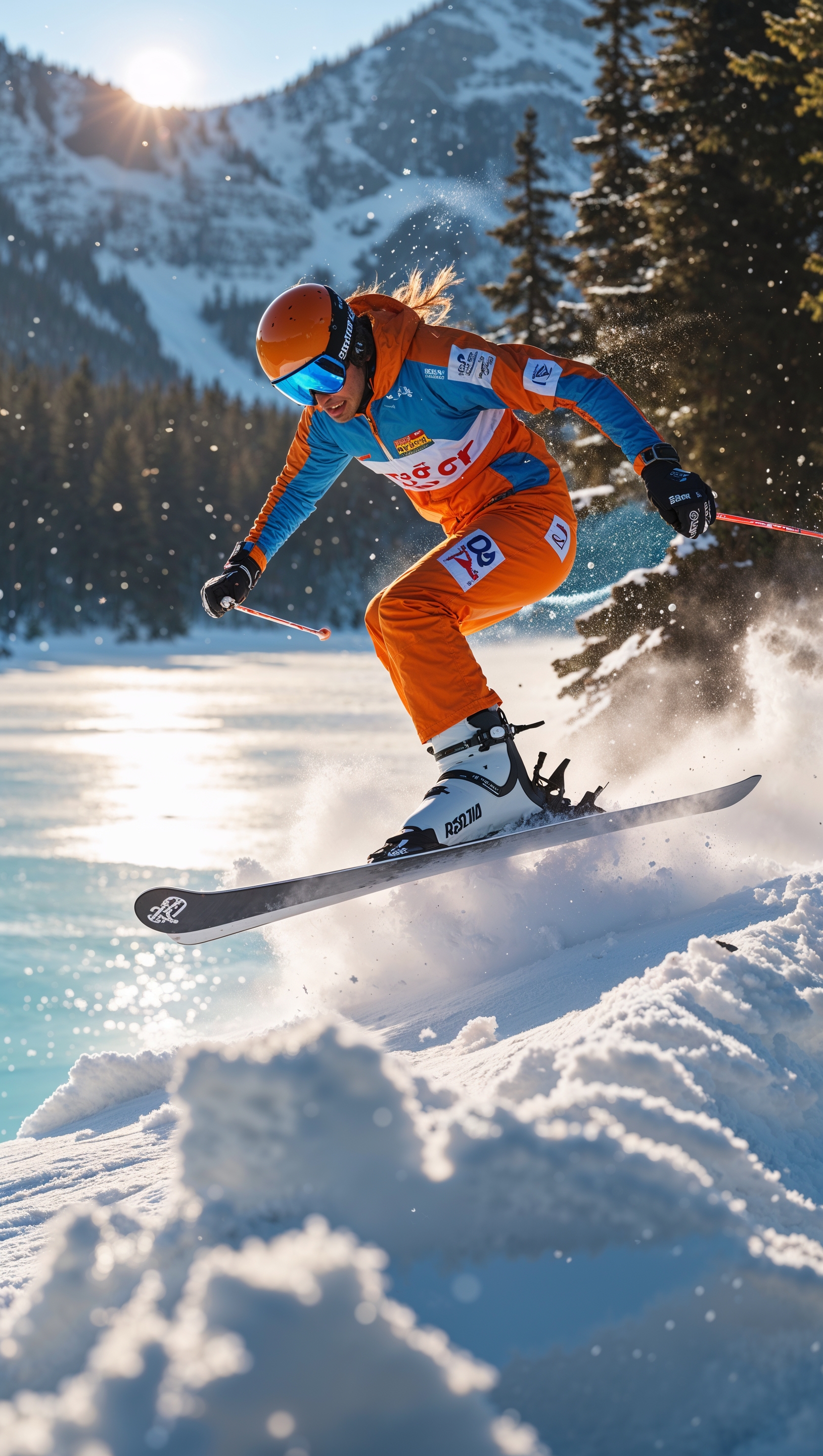 1664x2944 A skier jumping over a frozen lake, extreme action