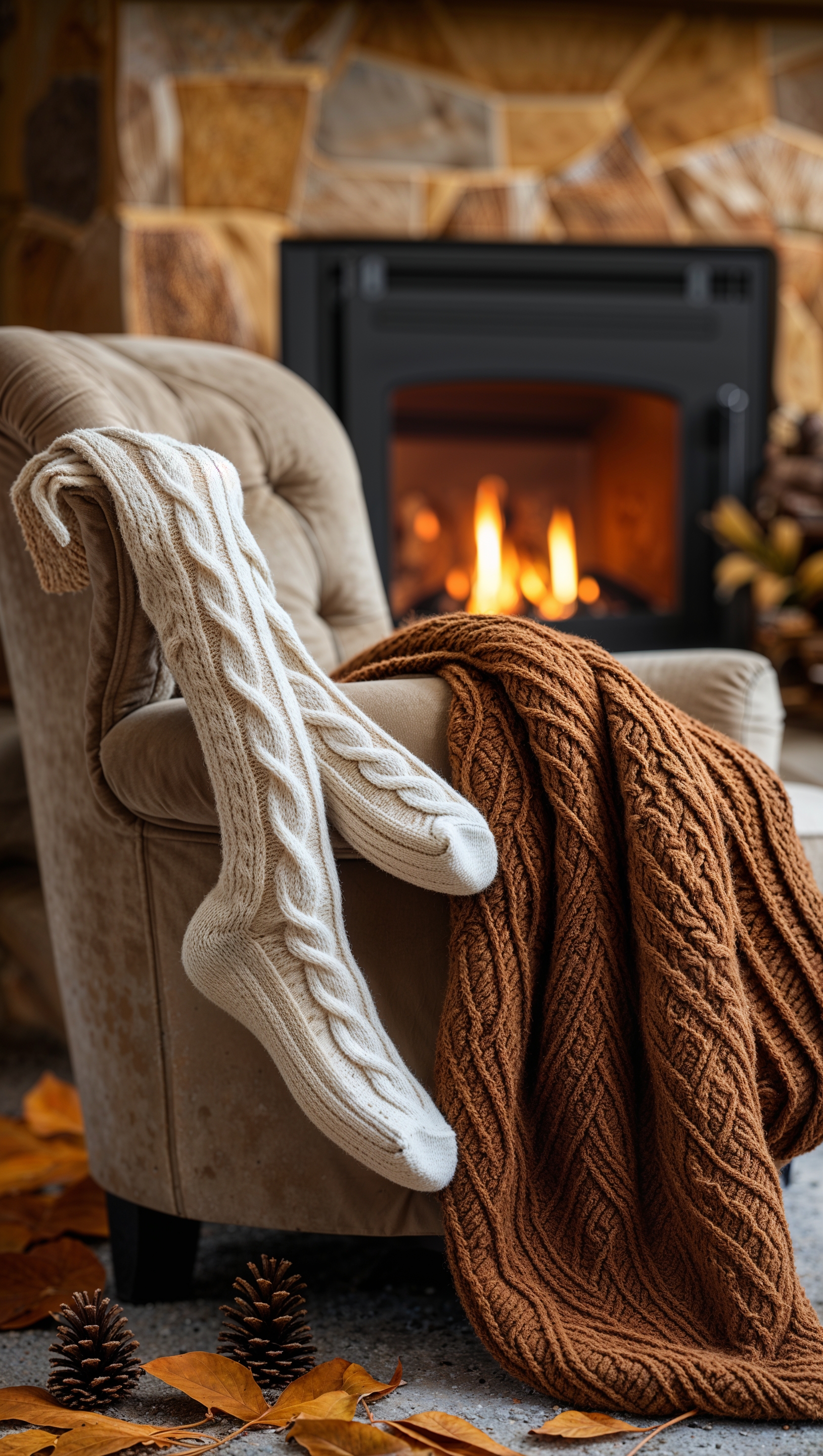1664x2944 Knitted socks and a woolen blanket by the fireplace