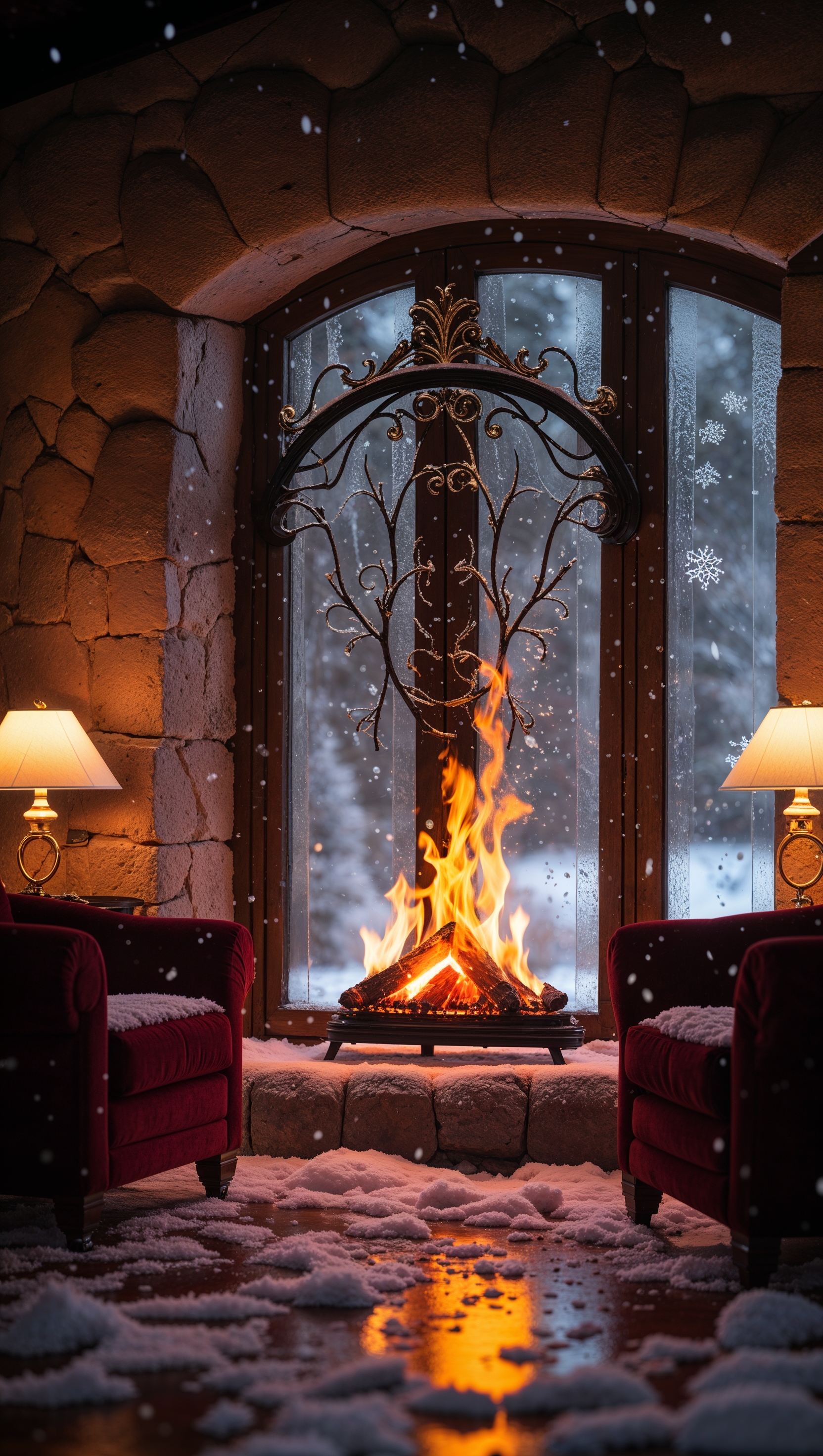 1664x2944 Warm fireplace scene with snow falling outside the window