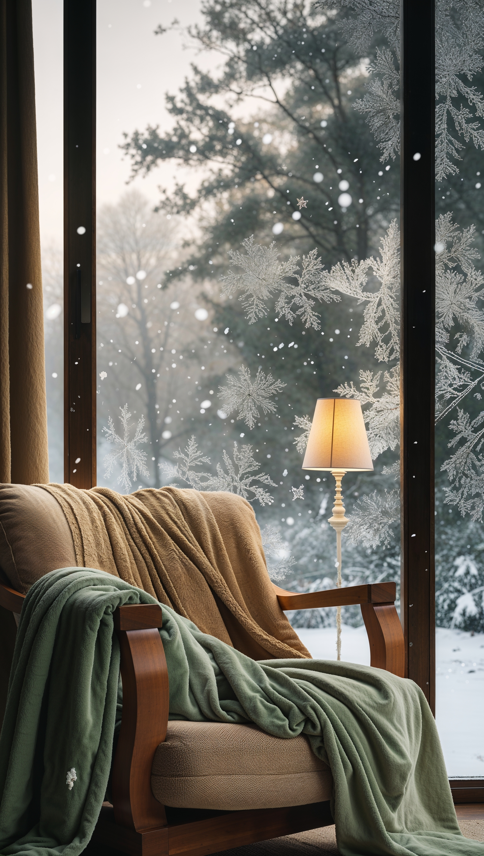 1664x2944 A cozy armchair with a knitted throw and a snowy window view