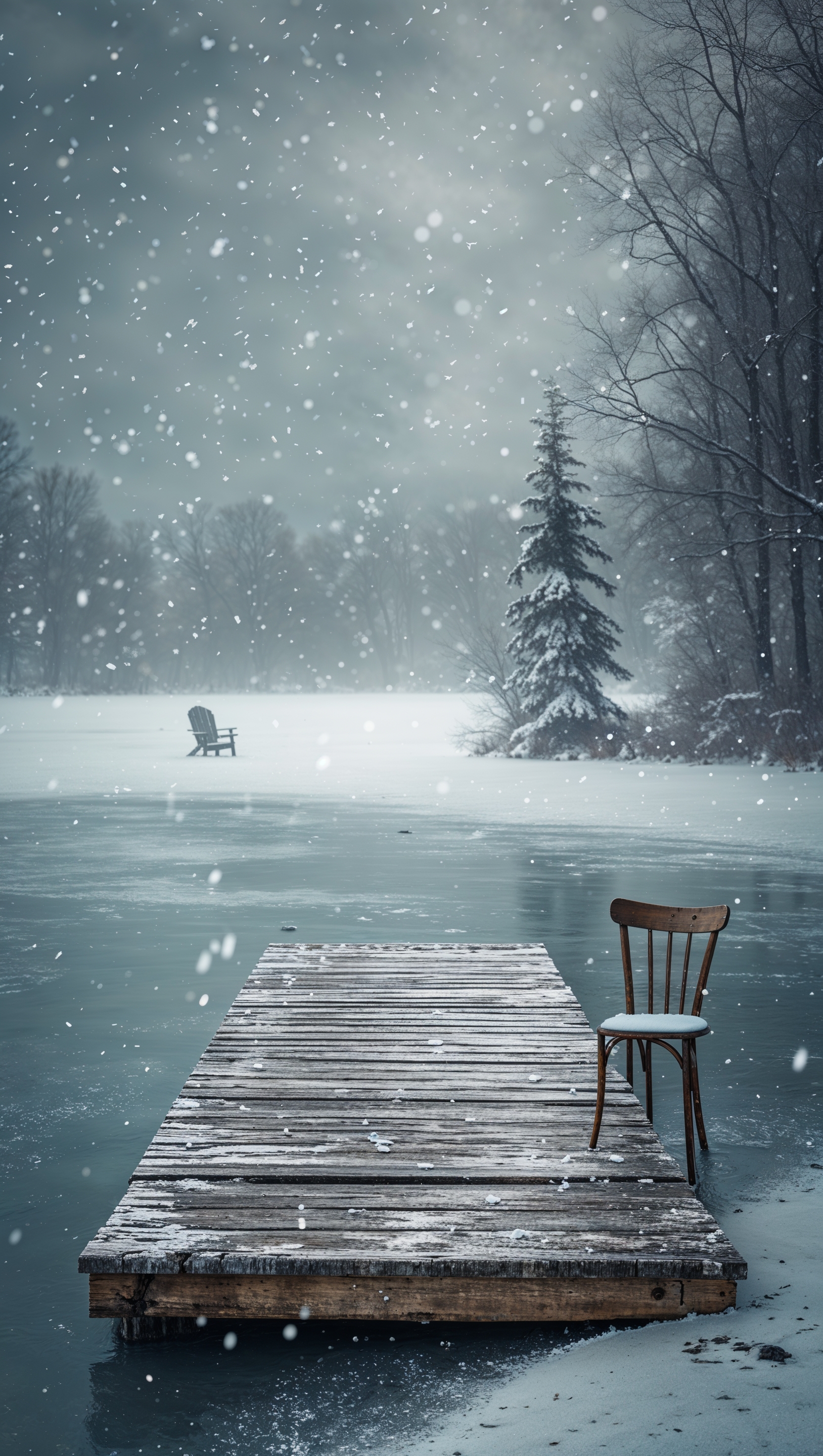 1664x2944 Frozen lake with a wooden dock and soft snowflakes falling