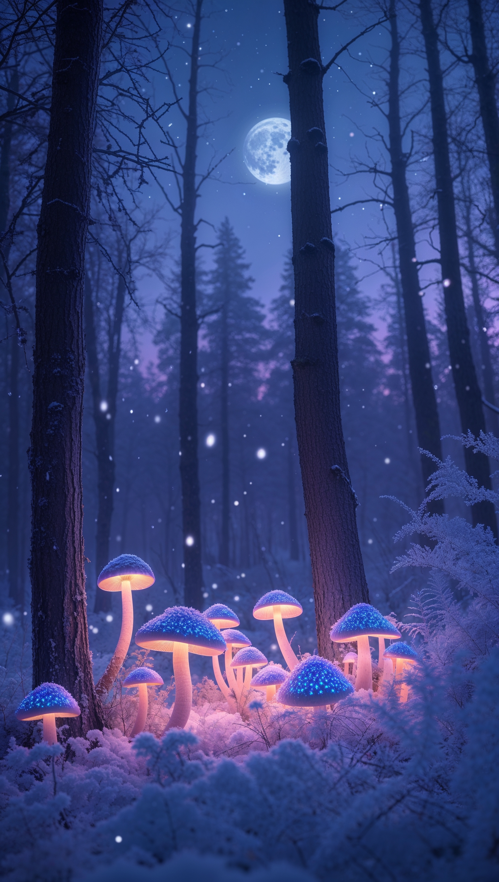 1664x2944 A magical winter forest with glowing mushrooms and snowflakes