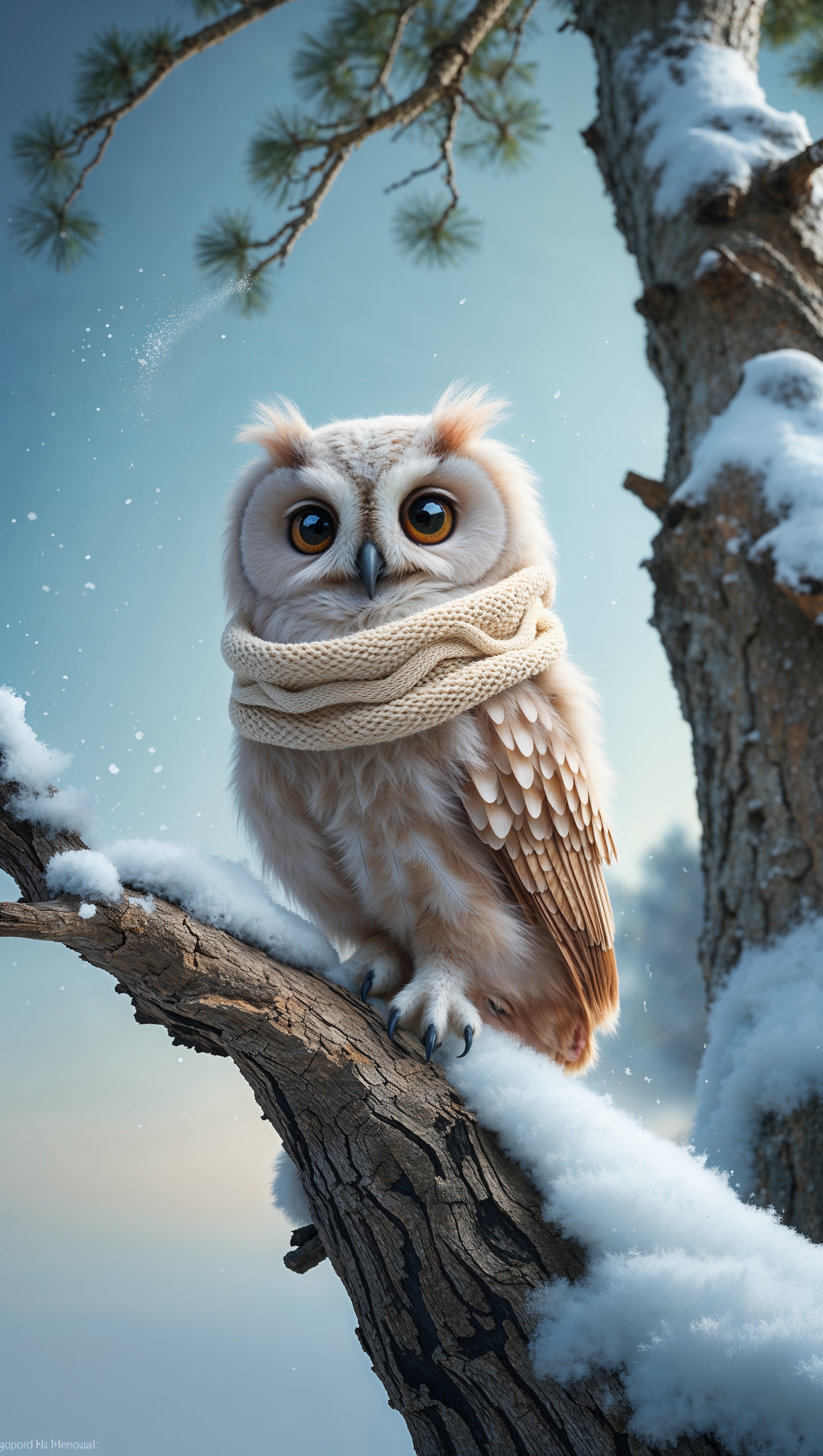 1664x2944 A cozy owl with a tiny scarf perched on a snowy branch