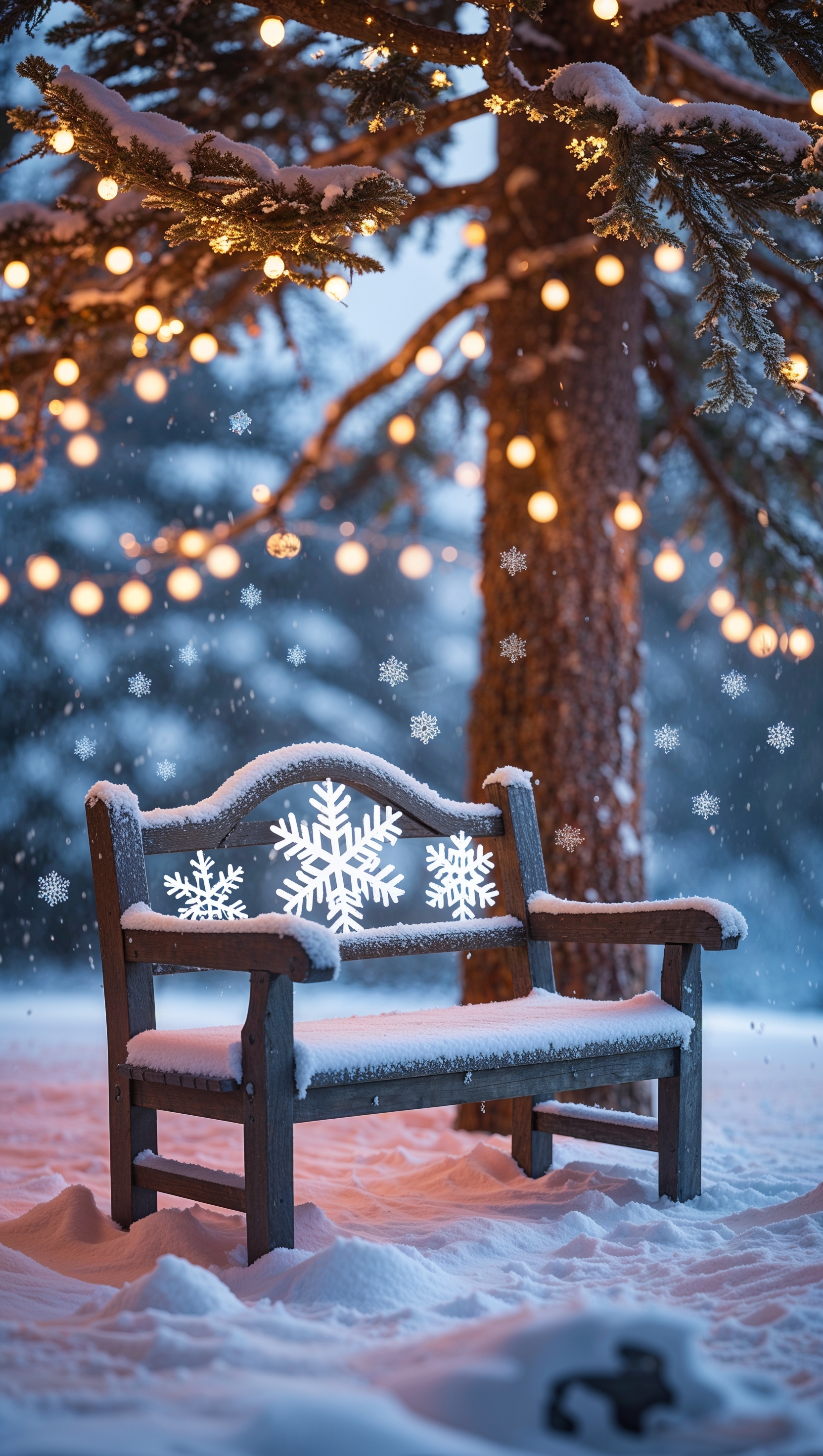 1664x2944 A snow-covered bench under twinkling string lights