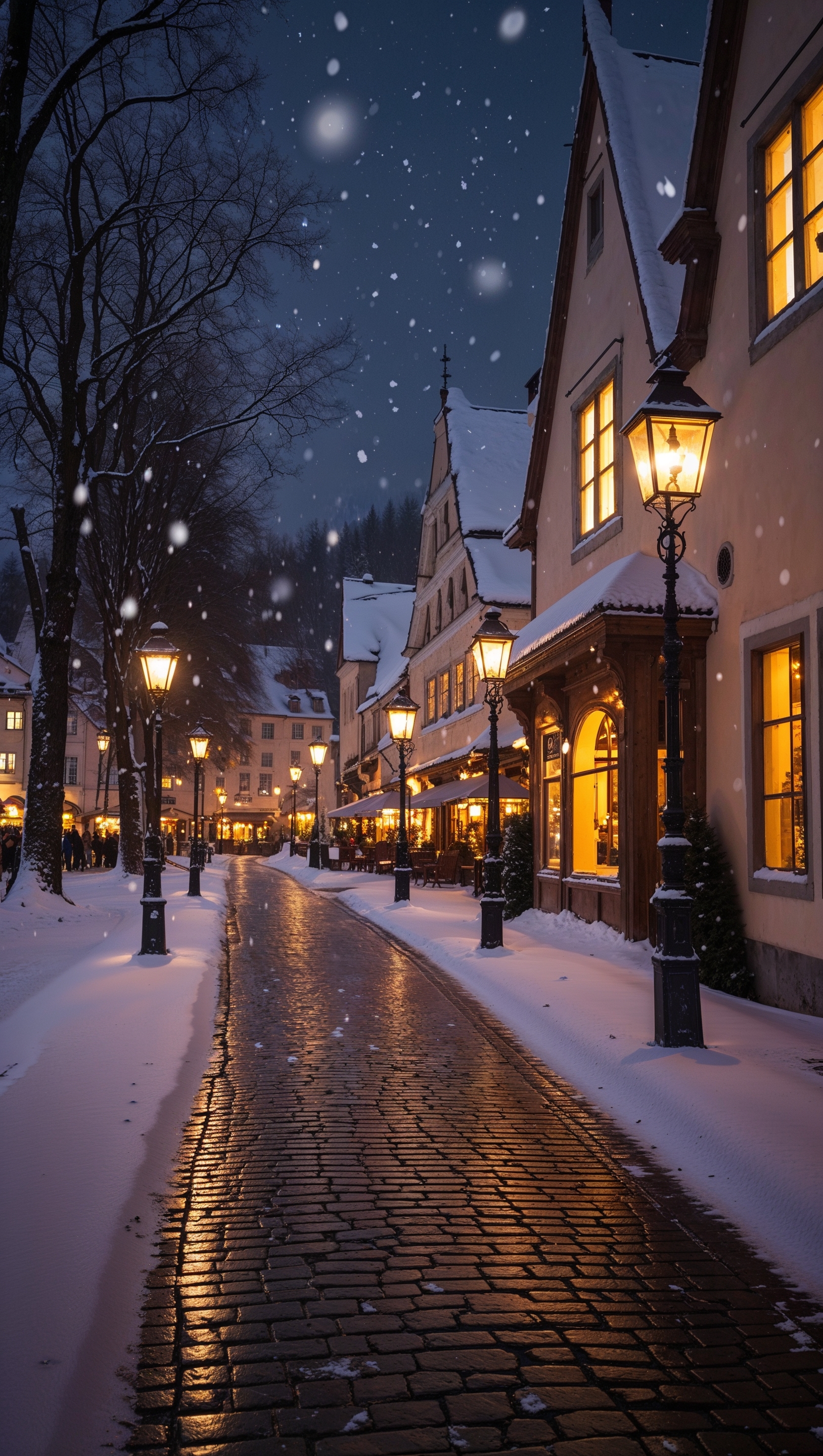 1664x2944 Snowy street in a cozy European town at night