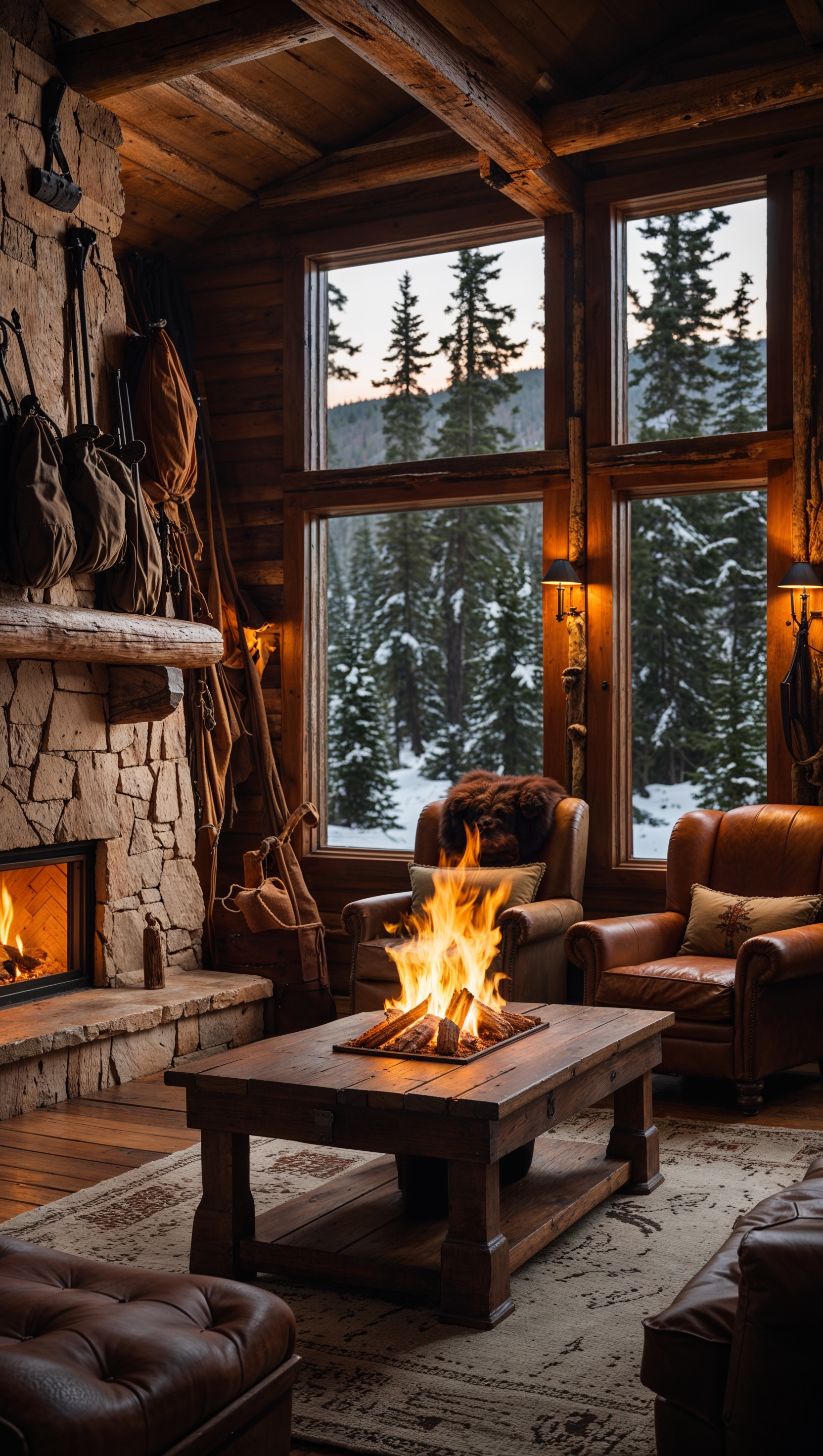1664x2944 A rustic wooden cabin interior with a roaring fireplace