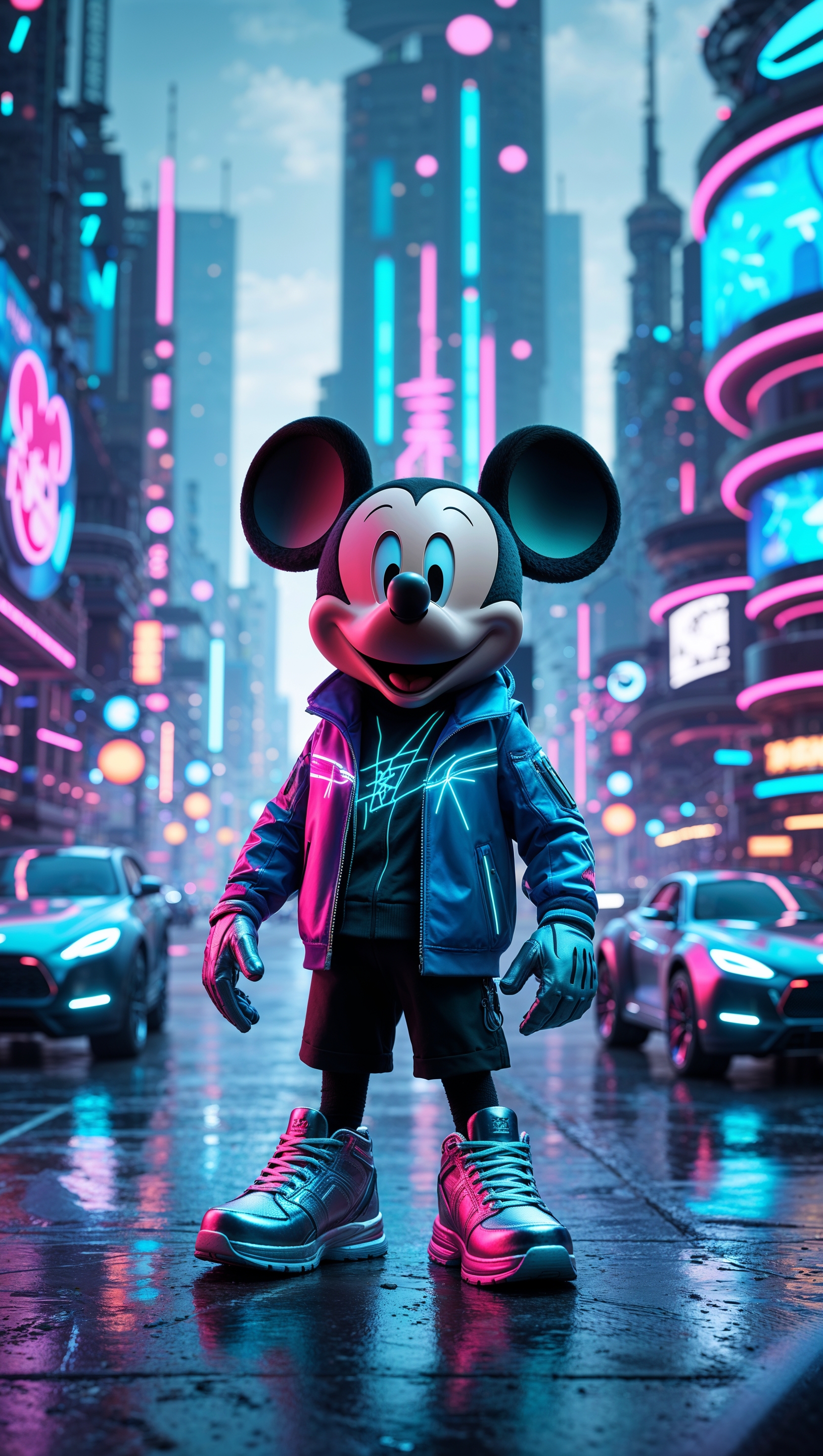 1664x2944 Mickey Mouse in modern clothes in a futuristic city, fantasy style