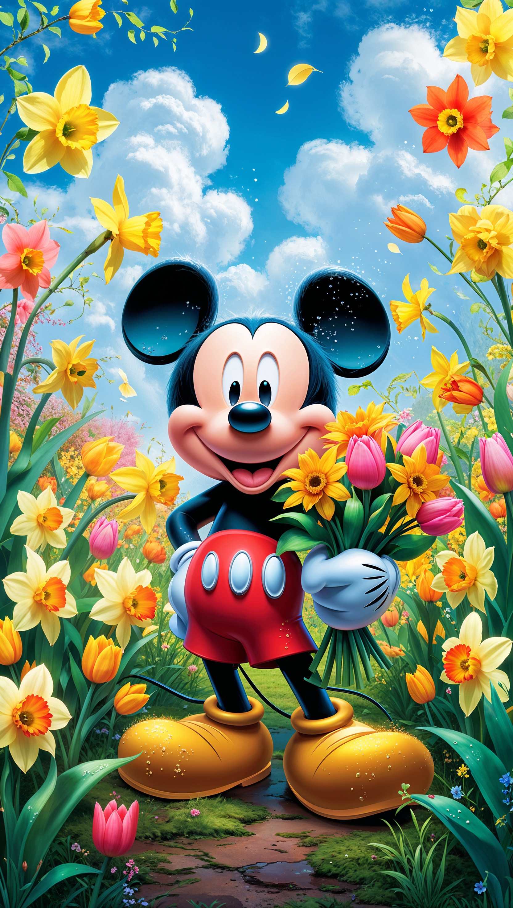 1664x2944 Mickey Mouse in a colorful flower garden, bright and vivid colors