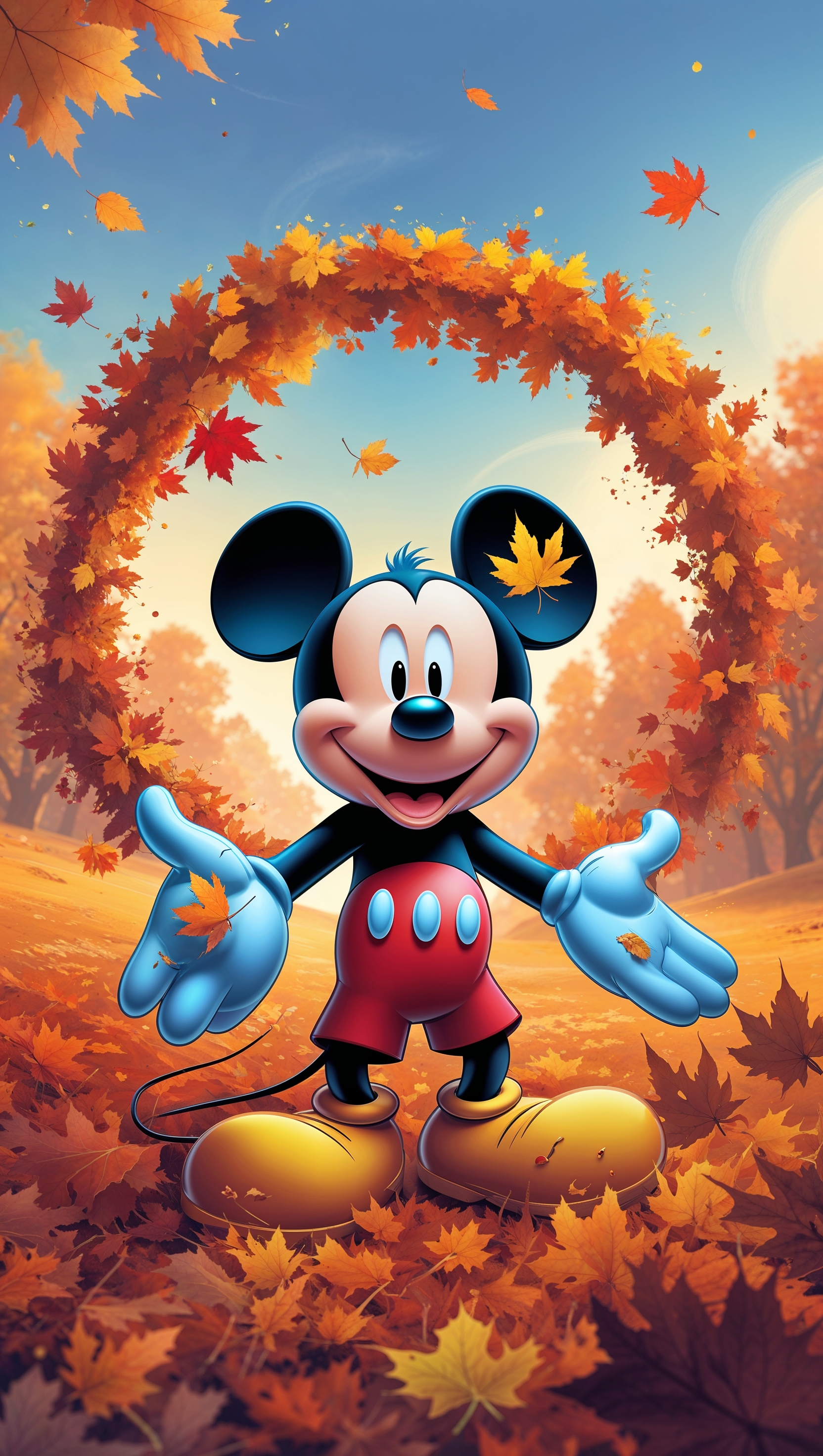 1664x2944 Mickey Mouse in autumn with orange and brown leaves