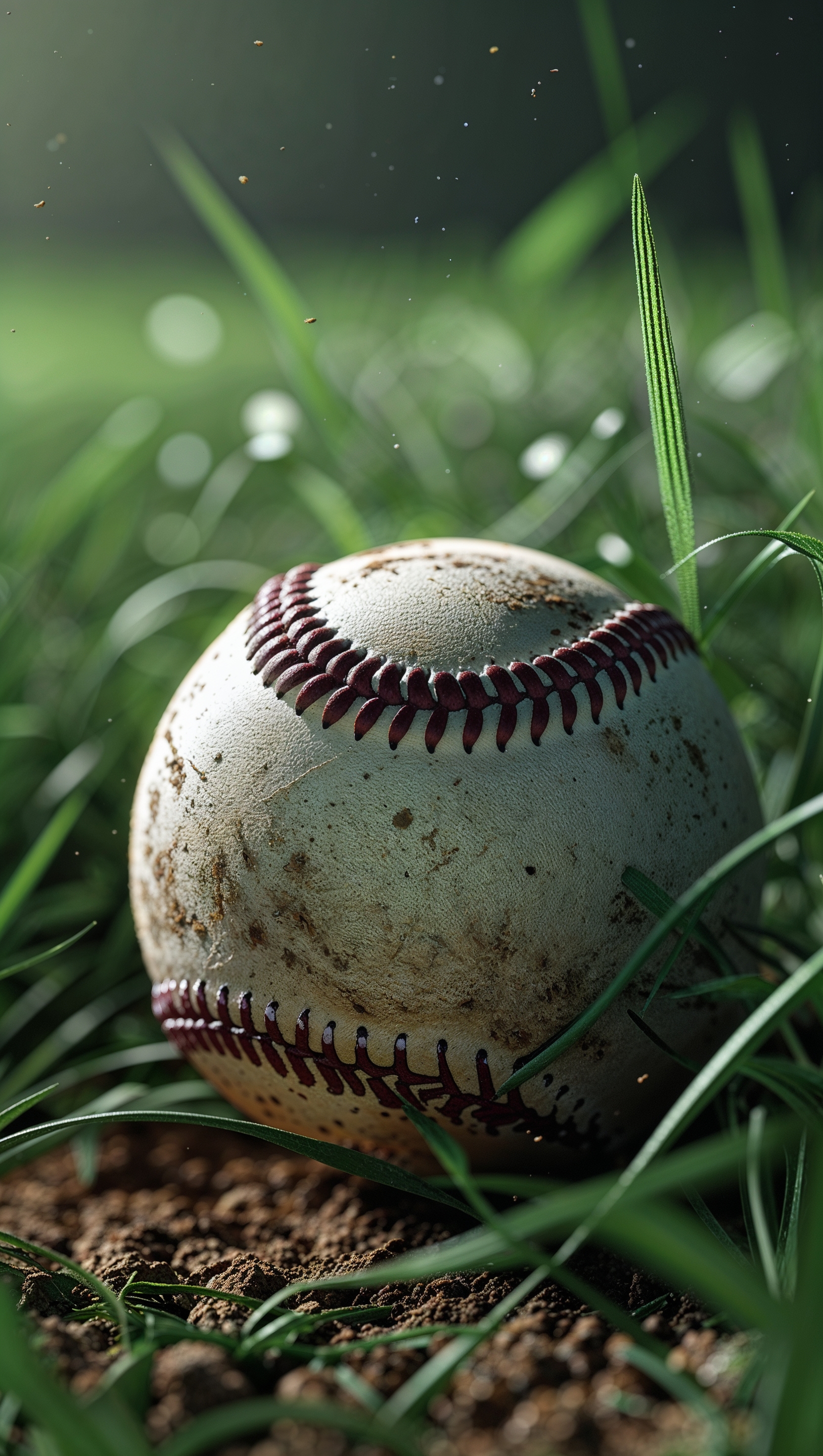 1664x2944 Close-up of a softball with grass and dirt textures, ultra-realistic, iPhone wallpaper