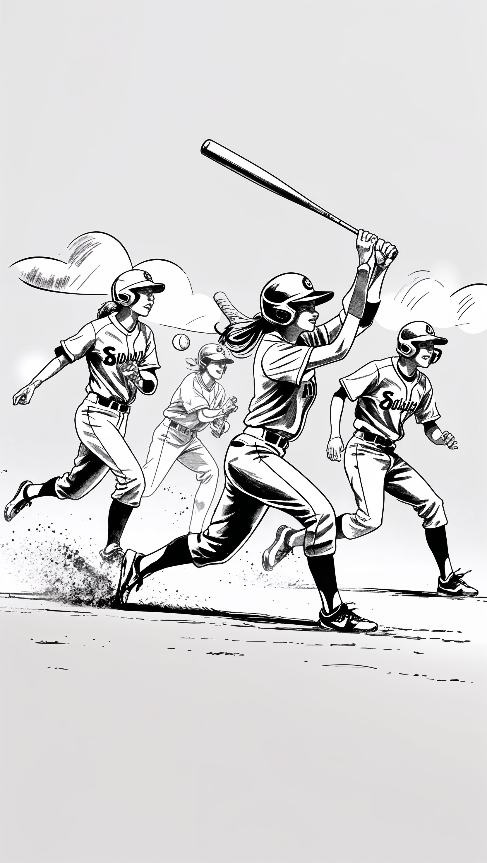 1664x2944 Hand-drawn sketch of a softball game, black and white, classic look, iPhone wallpaper