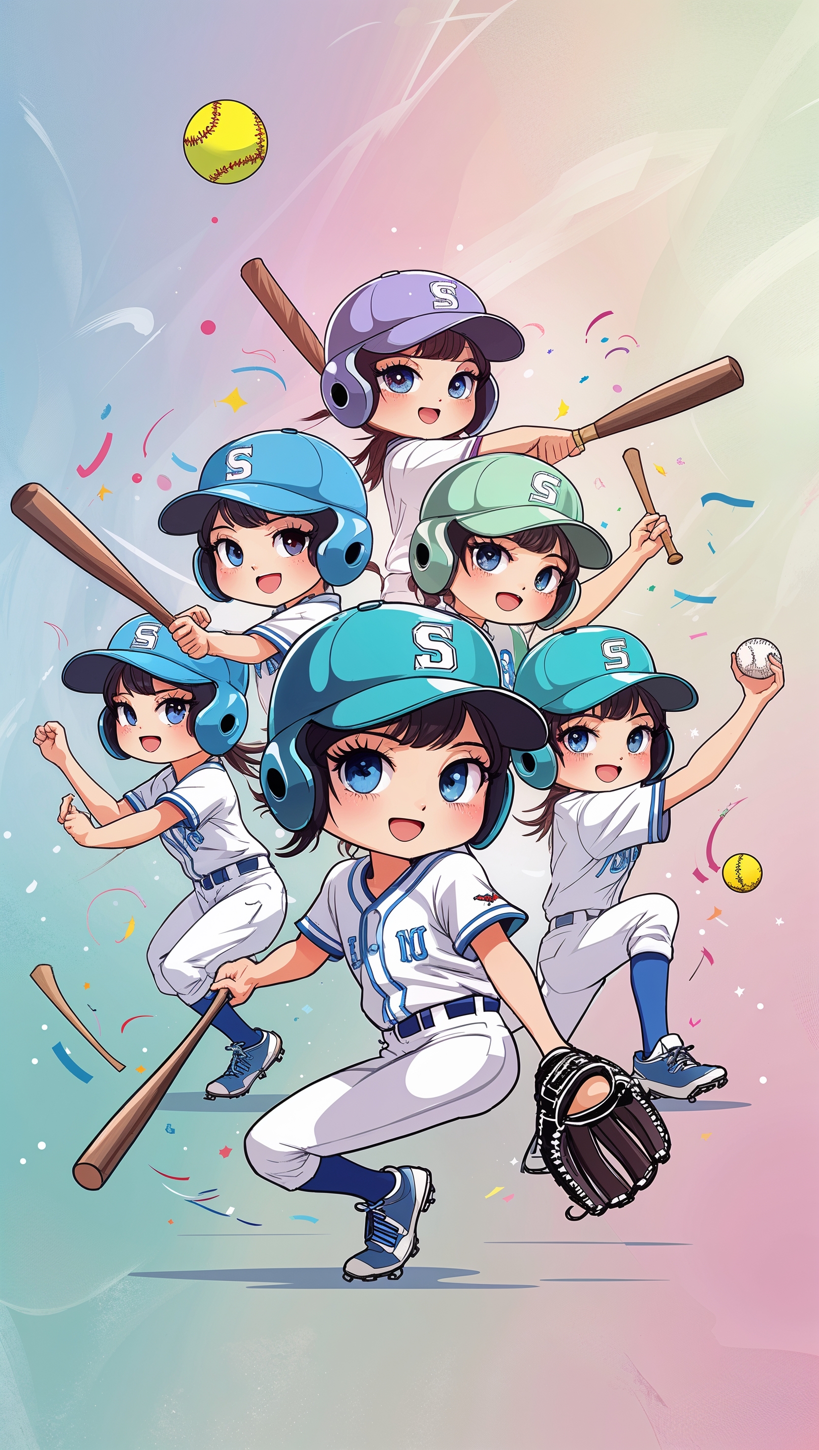 1664x2944 Cute chibi softball players, anime style, pastel colors, iPhone background