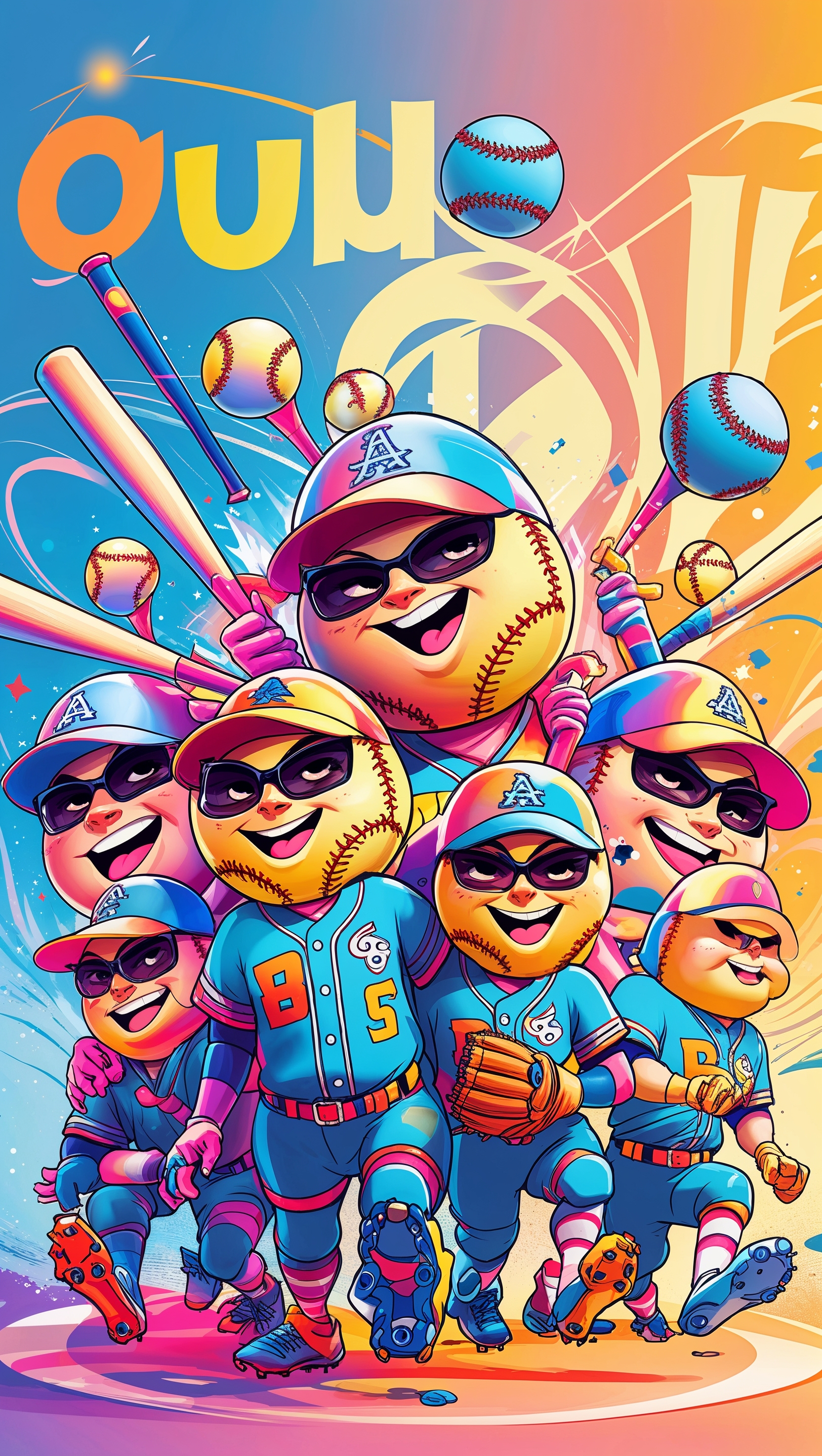 1664x2944 Cartoon-style softball characters in a fun scene, colorful, iPhone wallpaper