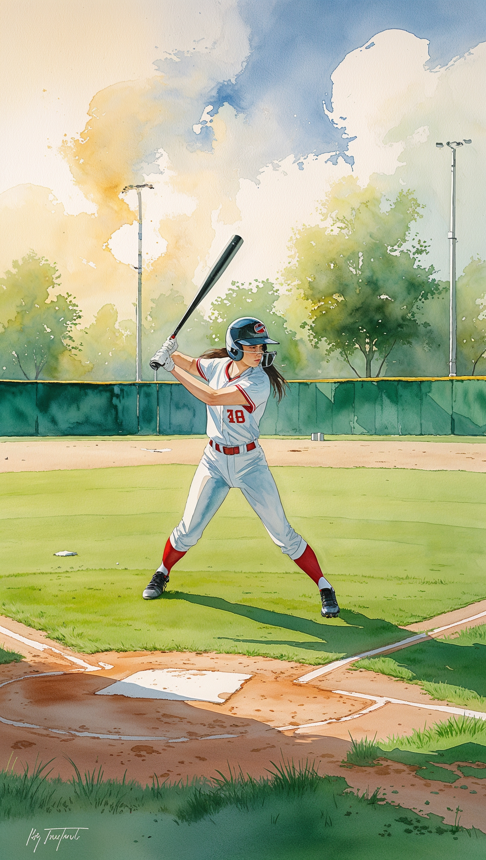 1664x2944 Watercolor painting of a softball scene, soft tones, artistic, iPhone background