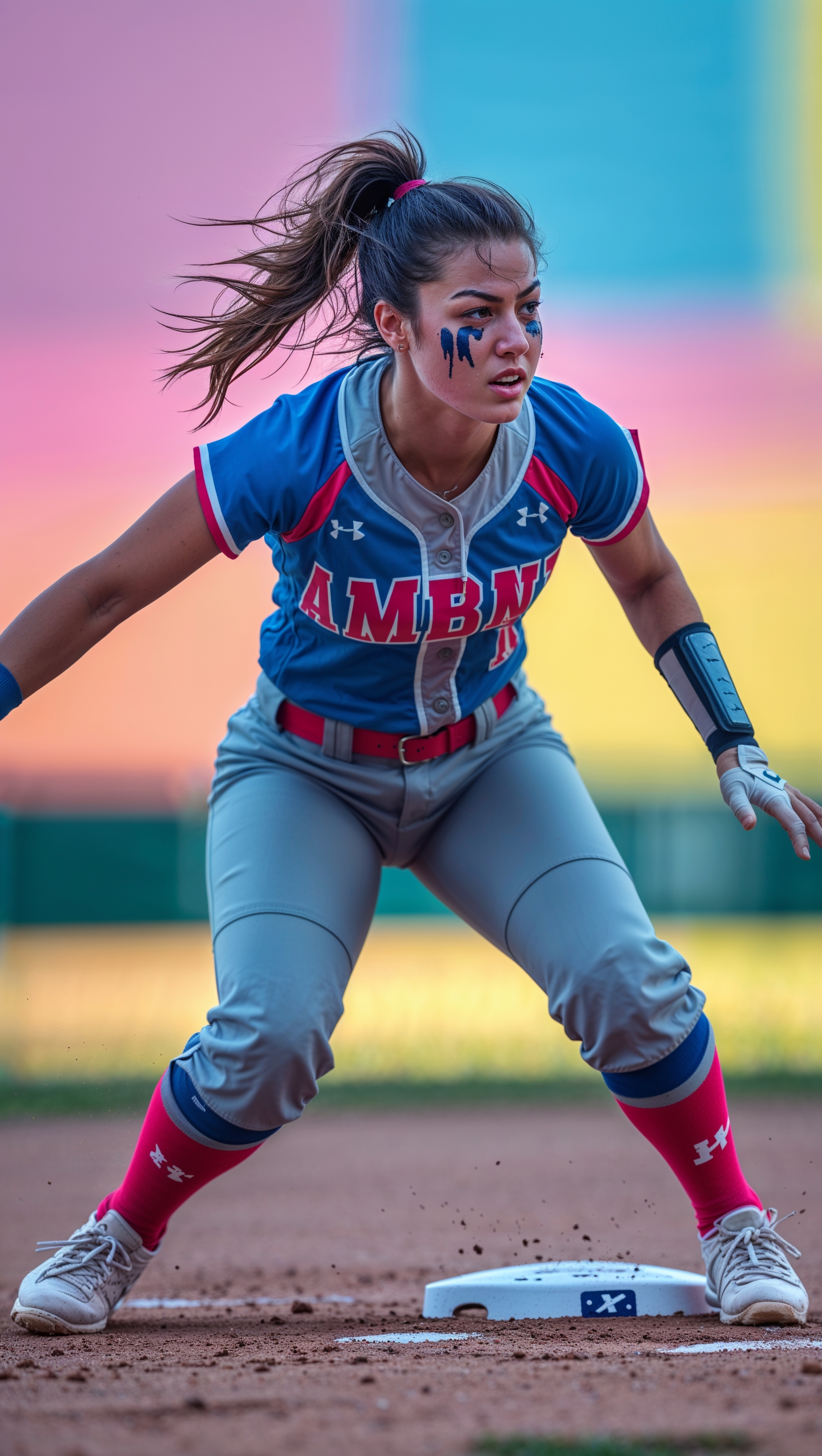1664x2944 Female softball player sliding into base, action shot, vibrant colors, iPhone background