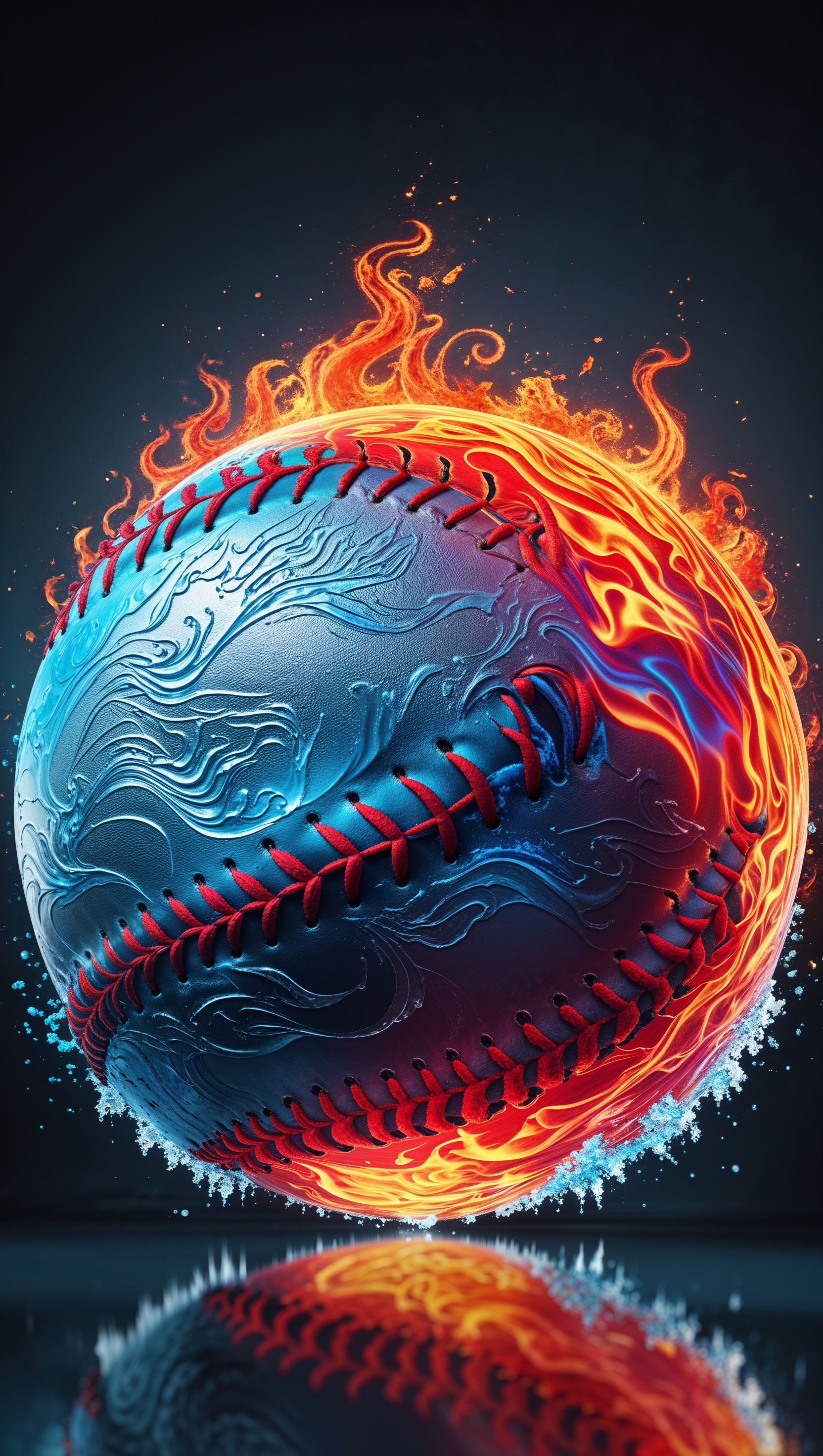 1664x2944 Fire and ice themed softball, epic design, intense colors, iPhone background
