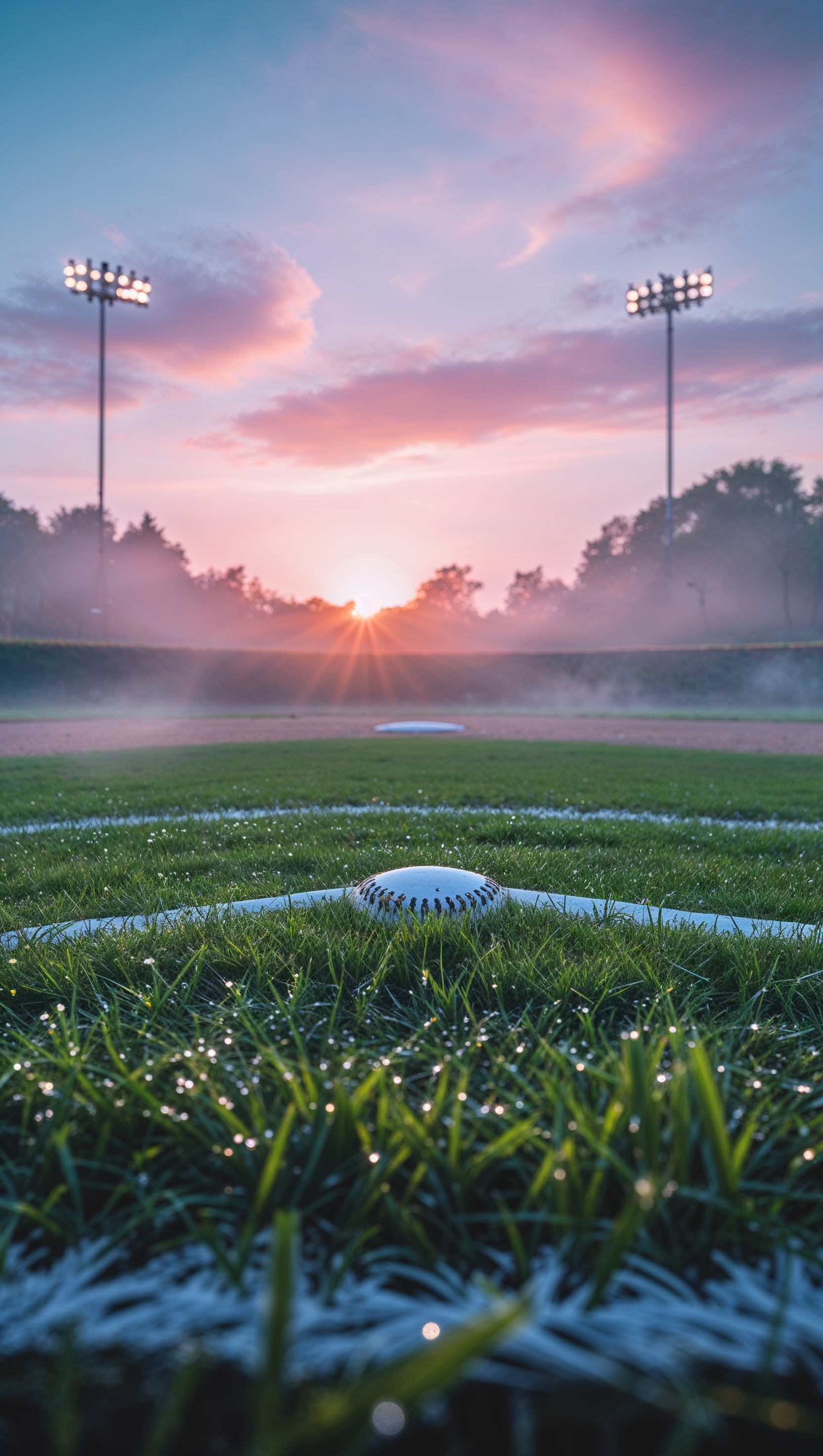 1664x2944 Softball field covered in morning dew, peaceful sunrise, iPhone wallpaper