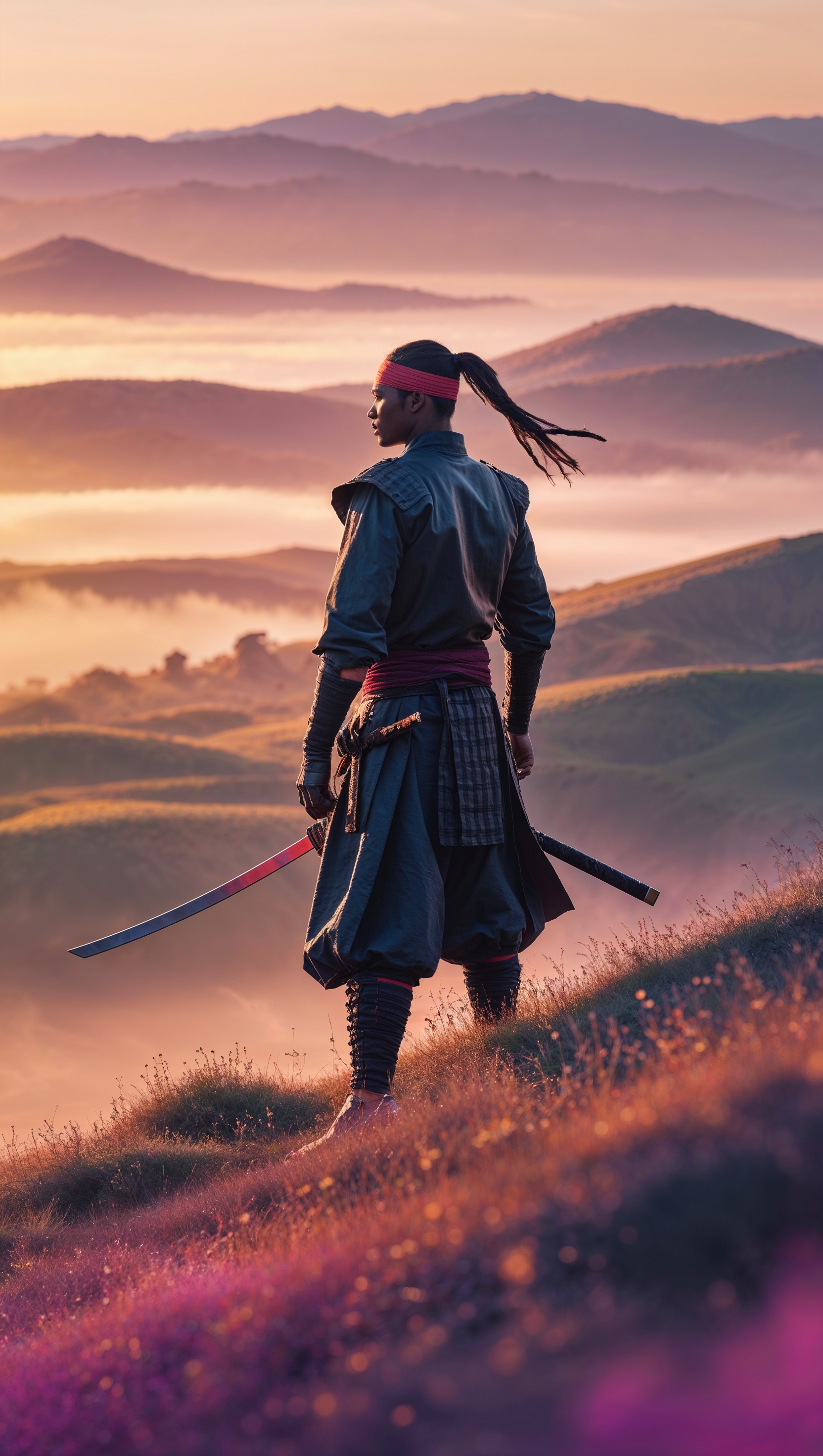 1664x2944 Golden hour scene of Afro Samurai overlooking a valley, cinematic iPhone wallpaper