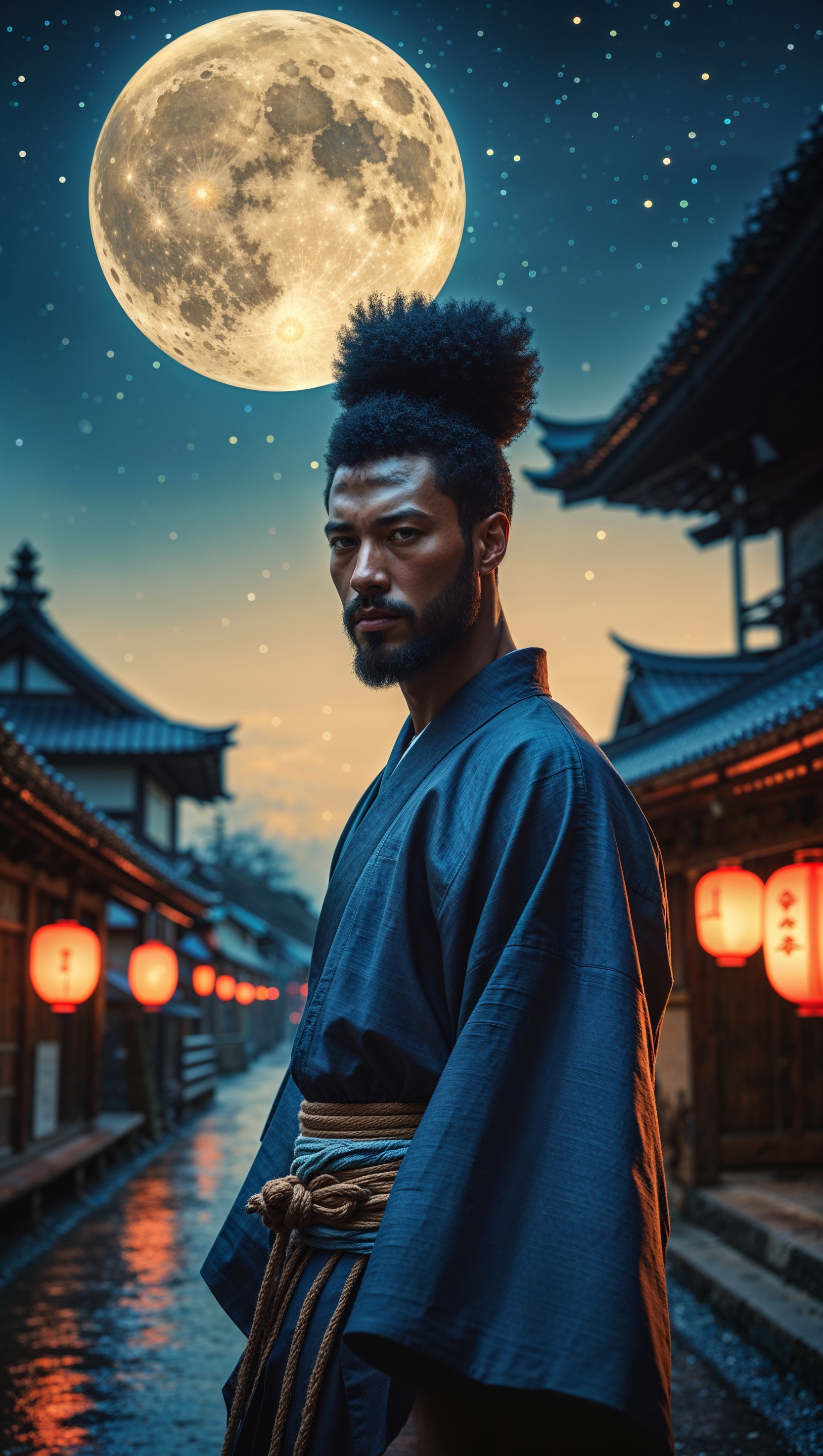 1664x2944 Afro Samurai in an ancient Japanese village, full moon in the sky, mystical iPhone wallpaper