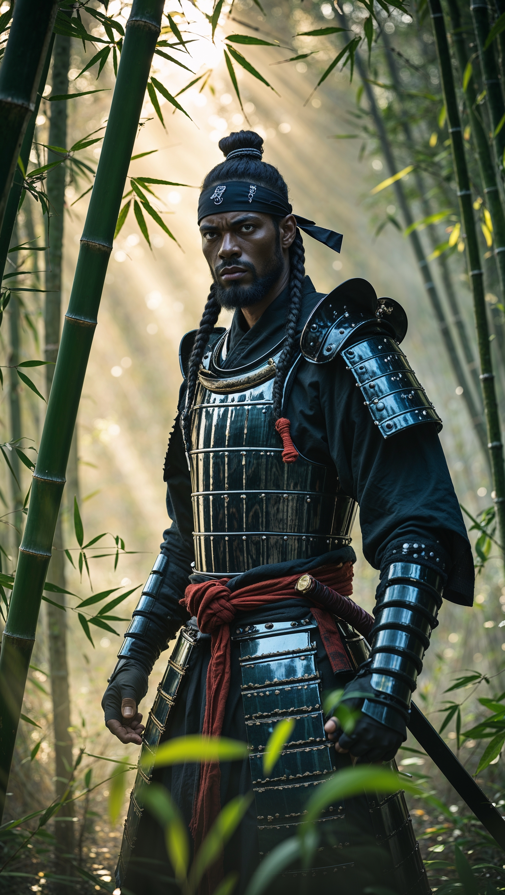 1664x2944 Afro Samurai standing in a bamboo forest, mist swirling around, cinematic iPhone wallpaper