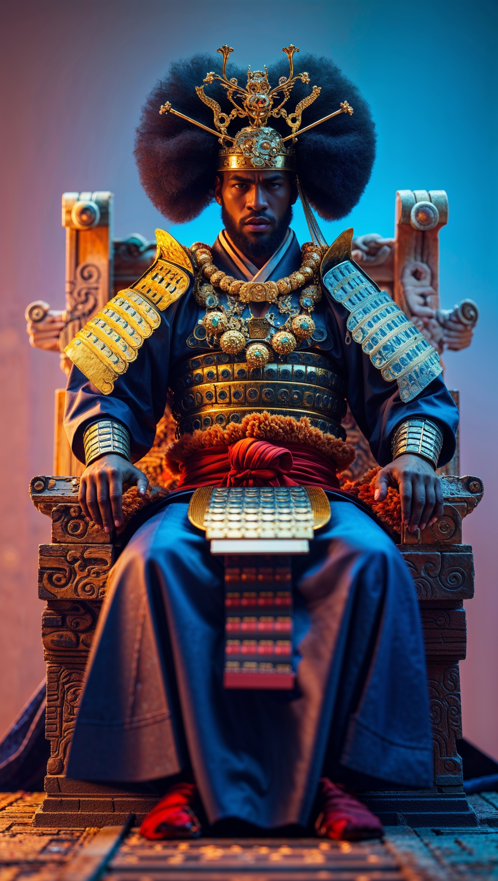 1664x2944 Afro Samurai sitting on a throne, looking powerful and regal, iPhone wallpaper