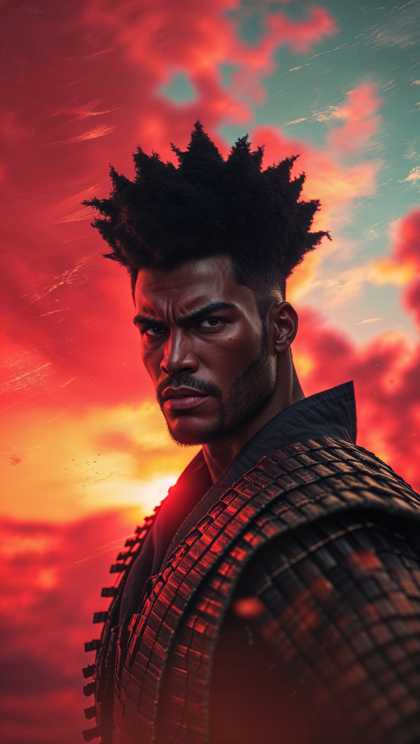 1664x2944 Afro Samurai against a backdrop of fiery sunset, intense red and orange hues, iPhone wallpaper
