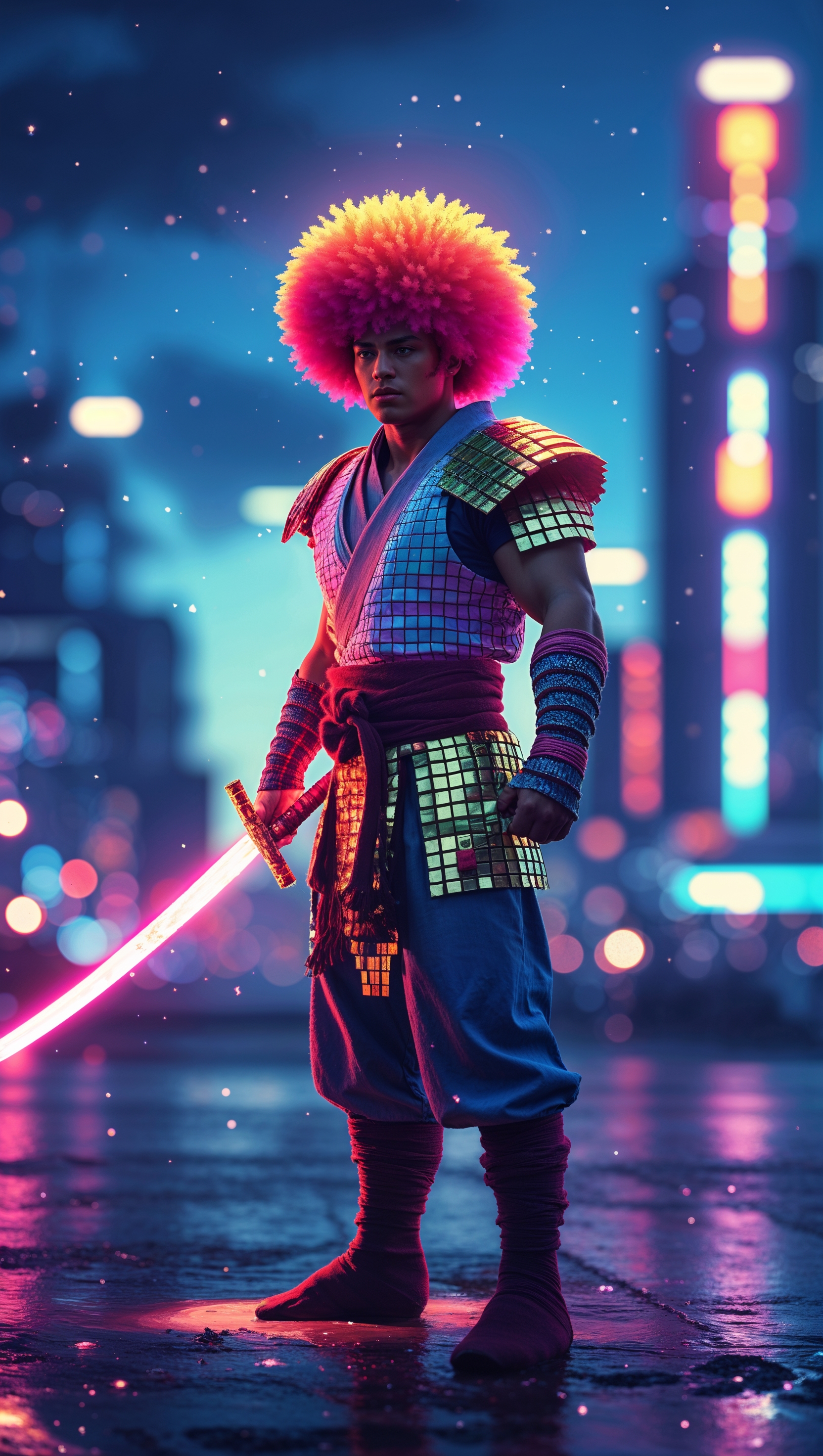 1664x2944 Afro Samurai standing on a futuristic rooftop, neon lights glowing around him, iPhone wallpaper style