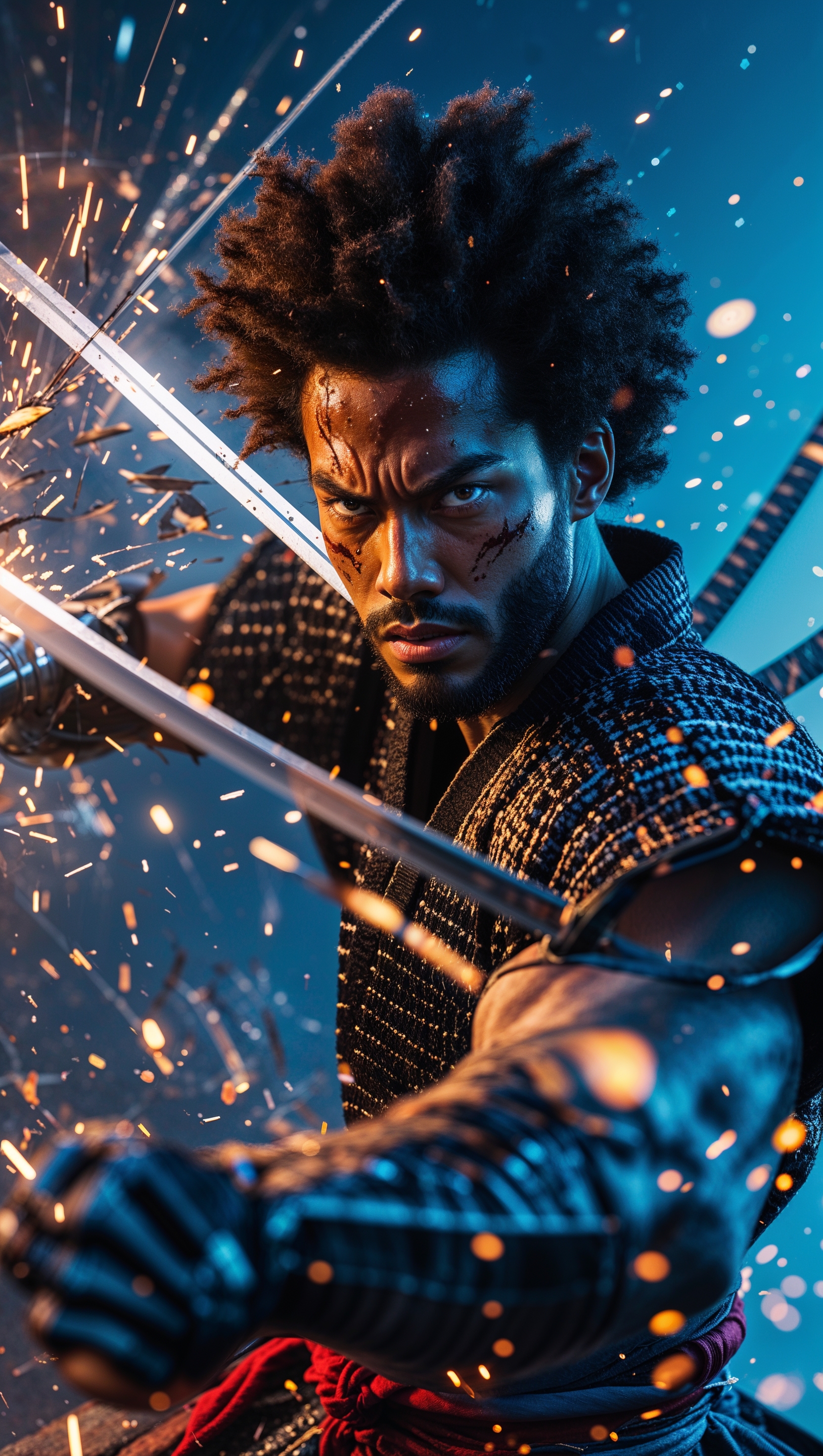 1664x2944 Afro Samurai in an intense sword clash, sparks flying, dynamic iPhone wallpaper