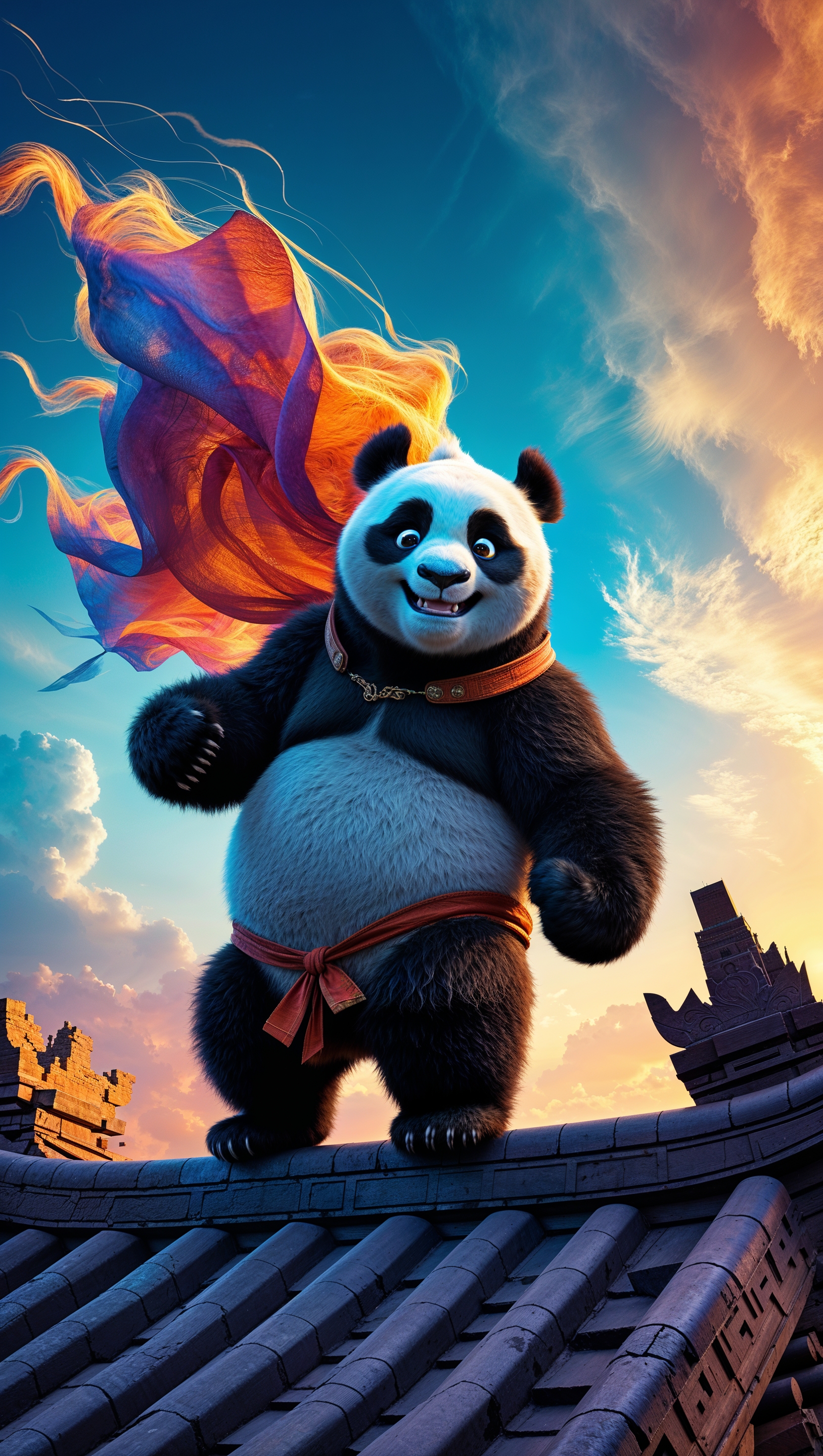 1664x2944 Po standing on a temple rooftop with his cape flowing in the wind
