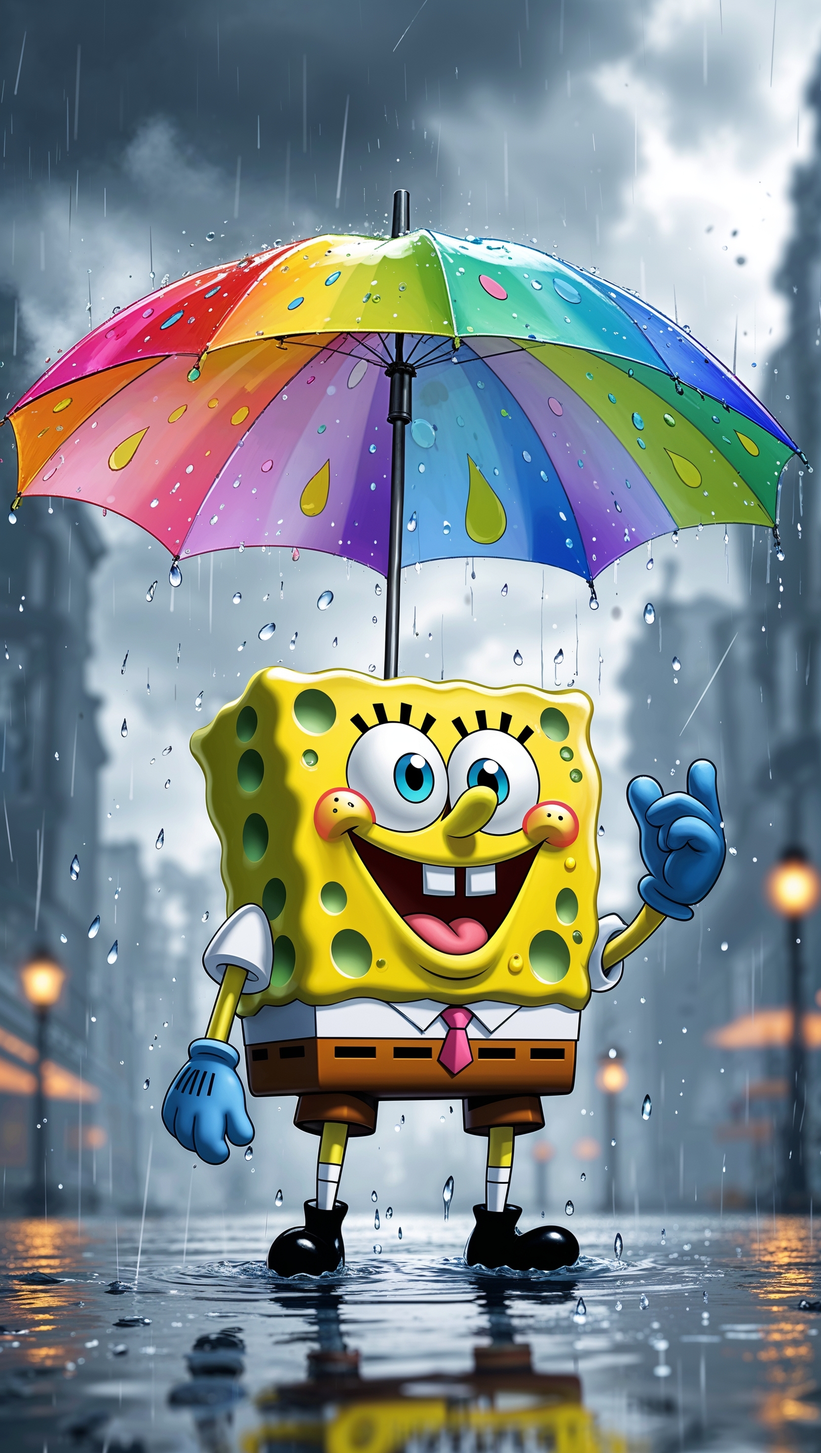 1664x2944 Spongebob under the rain with a colorful umbrella for iPhone wallpaper
