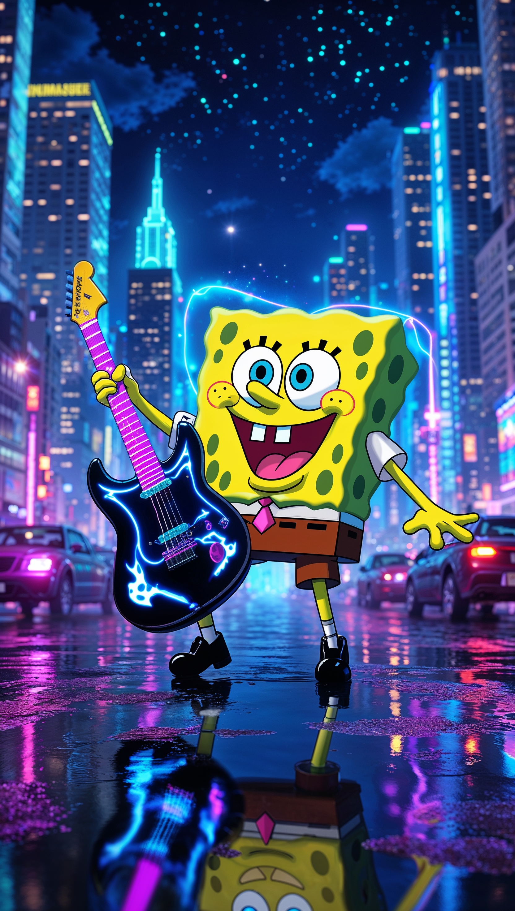 1664x2944 Spongebob playing guitar with neon lights at night for iPhone wallpaper