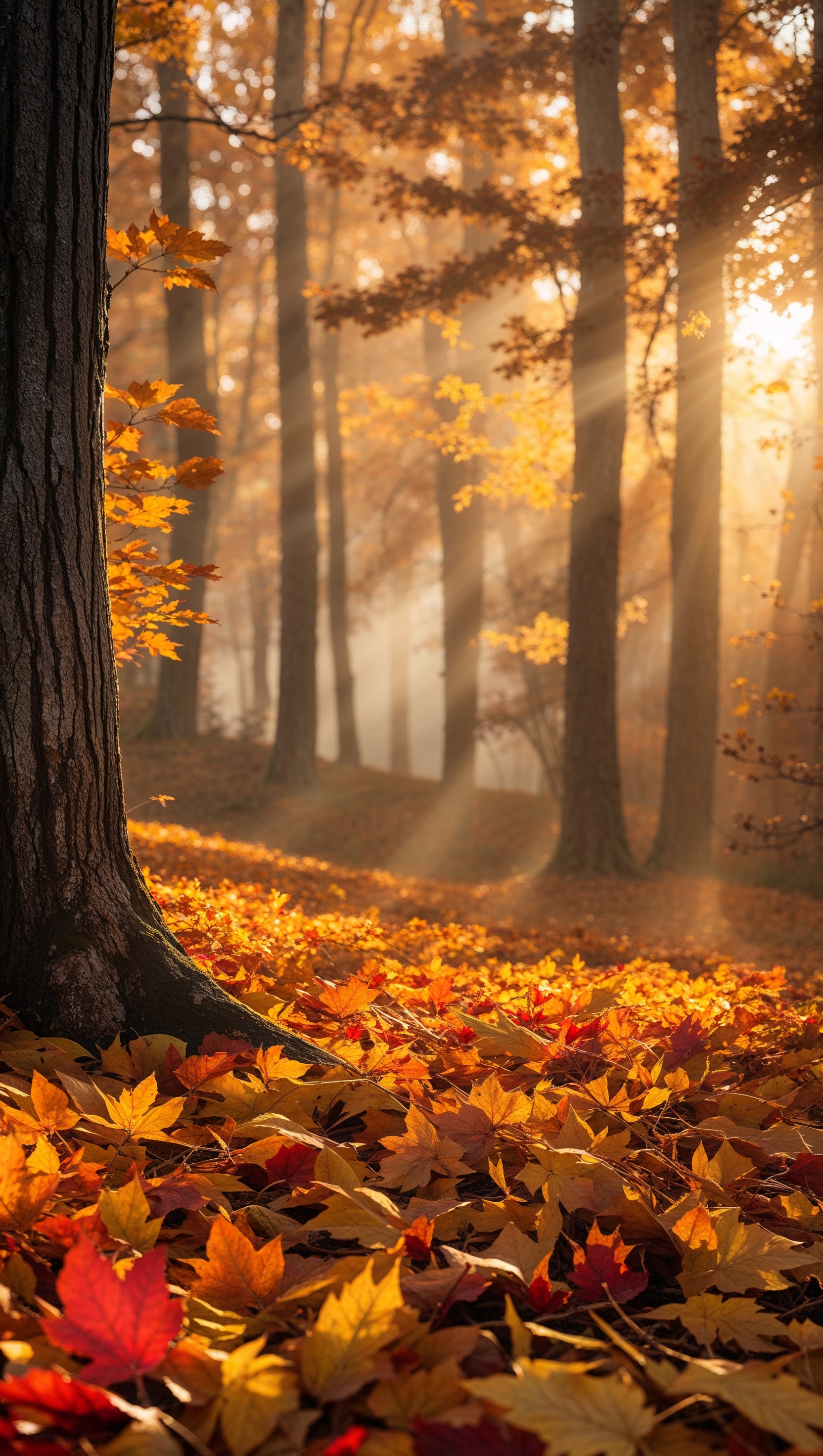 1664x2944 Golden autumn forest with falling leaves and soft sunlight, high resolution iPhone format