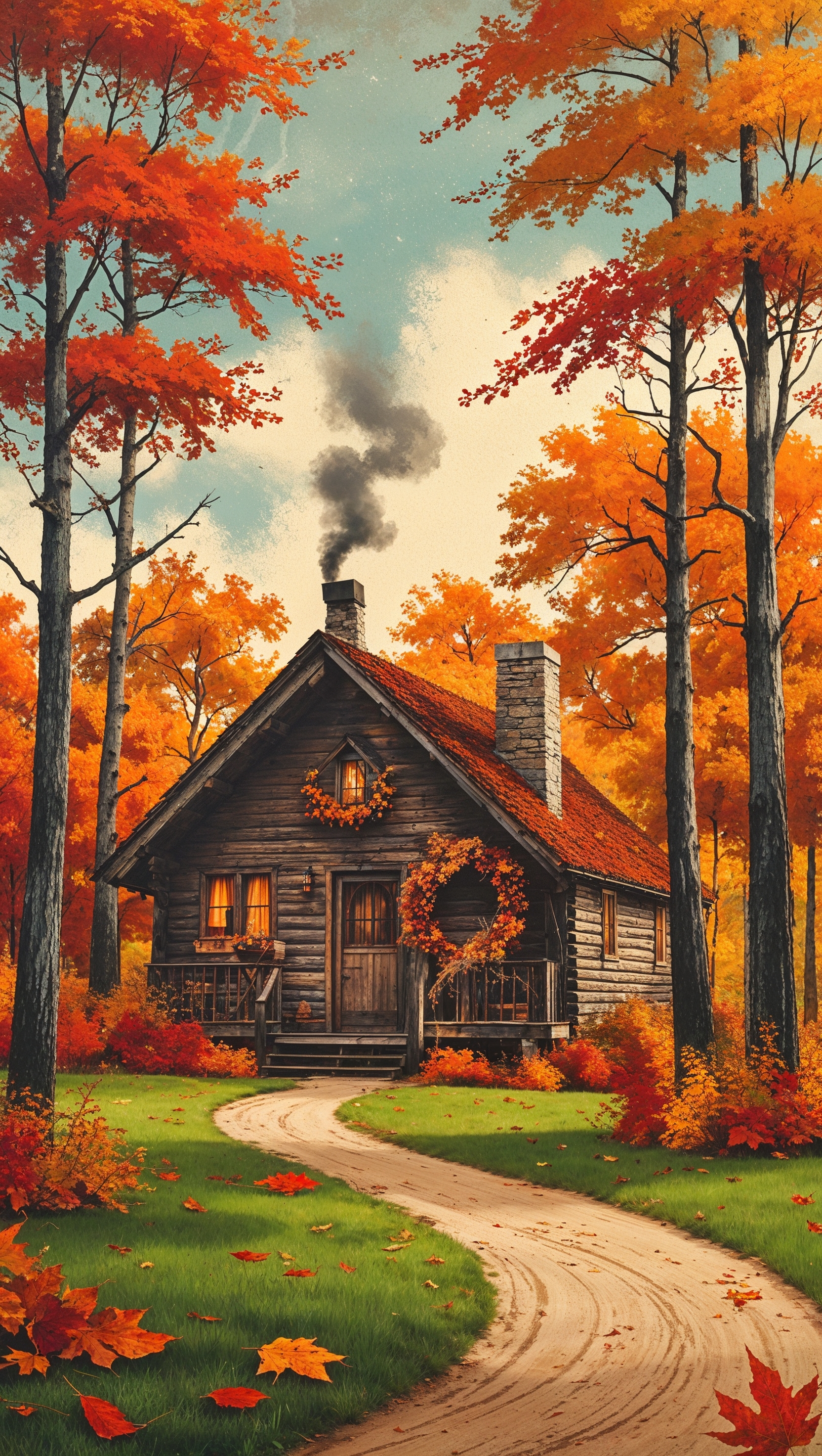 1664x2944 Vintage-style autumn postcard scene with cozy cabin and falling leaves
