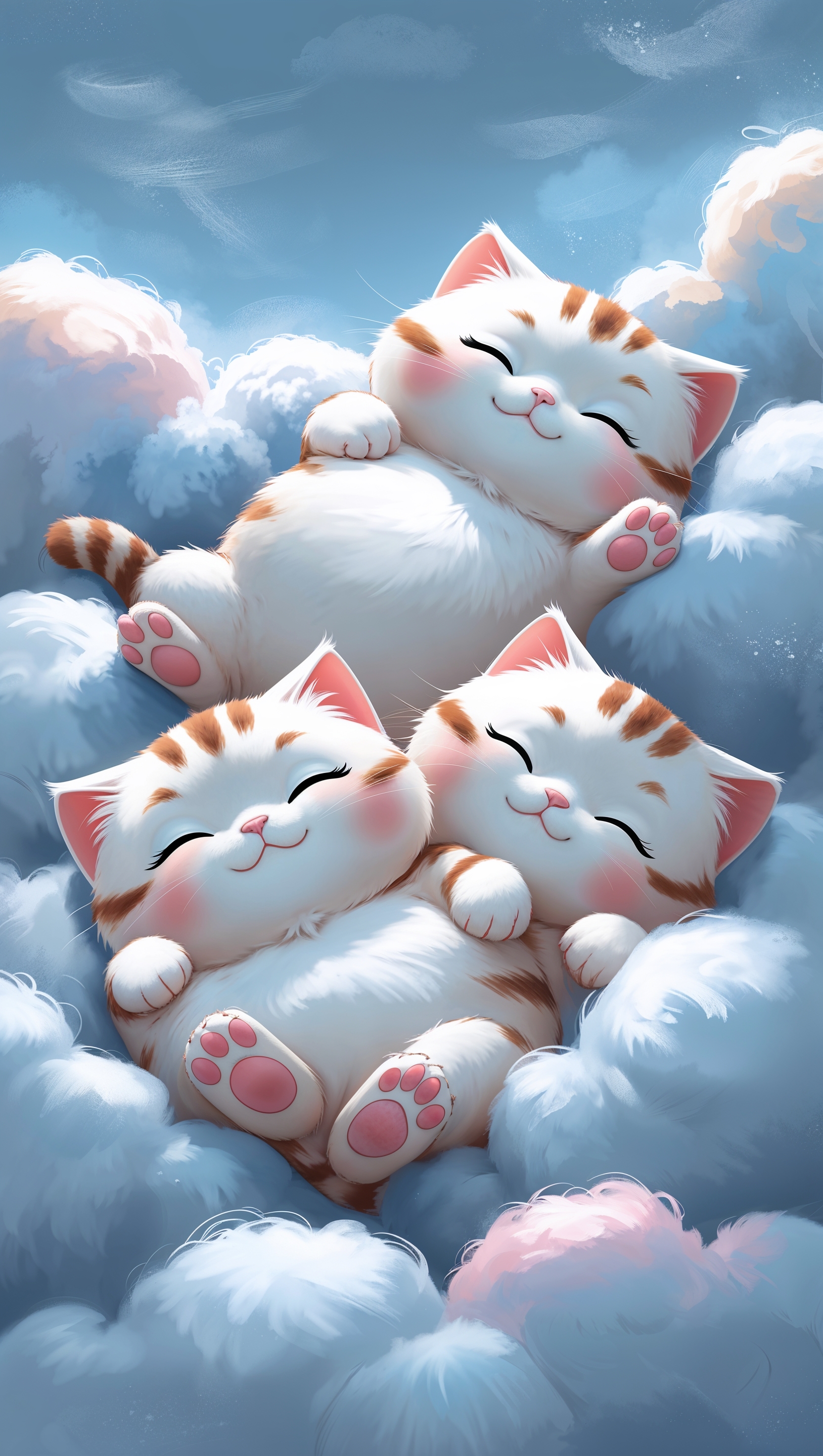 1664x2944 Chubby cartoon cats sleeping on fluffy clouds in sky blue background
