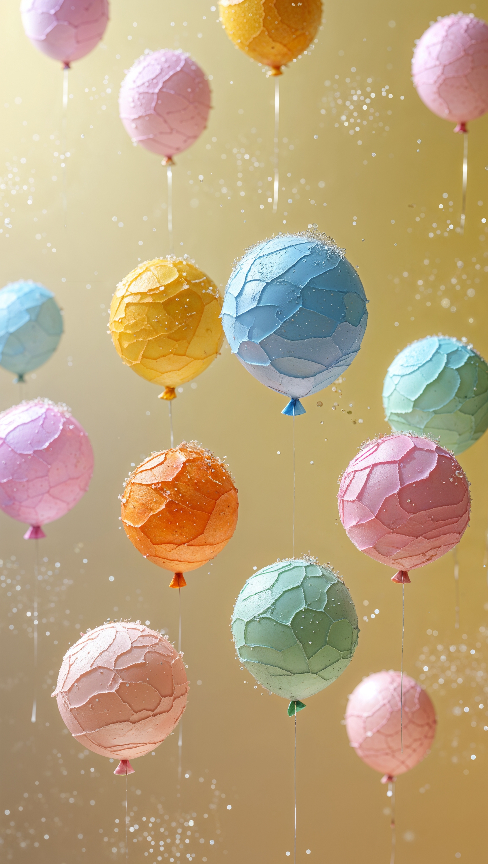 1664x2944 Tiny colorful balloons floating on soft yellow background with sparkles