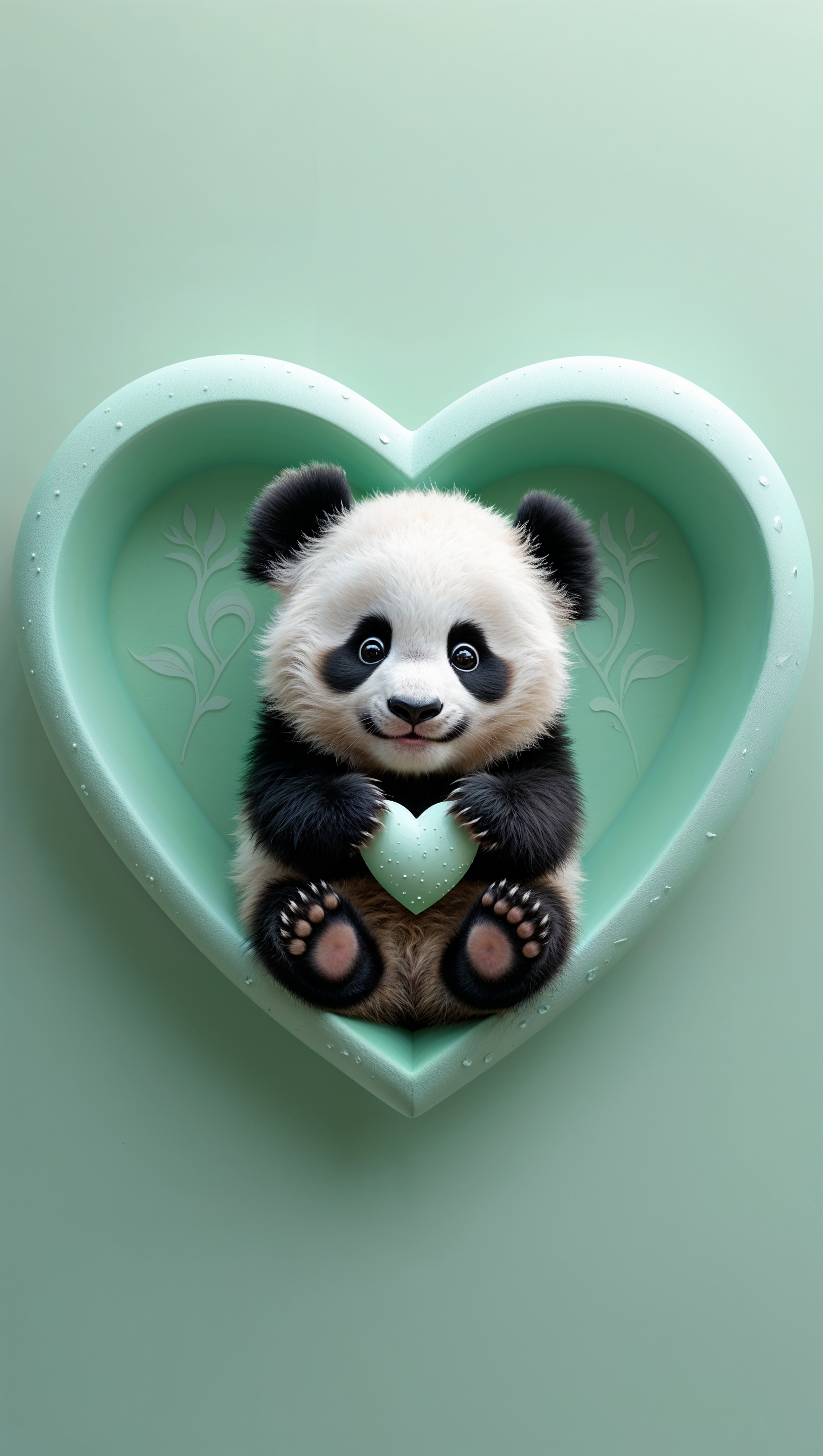1664x2944 Cute baby panda holding a heart on mint green background