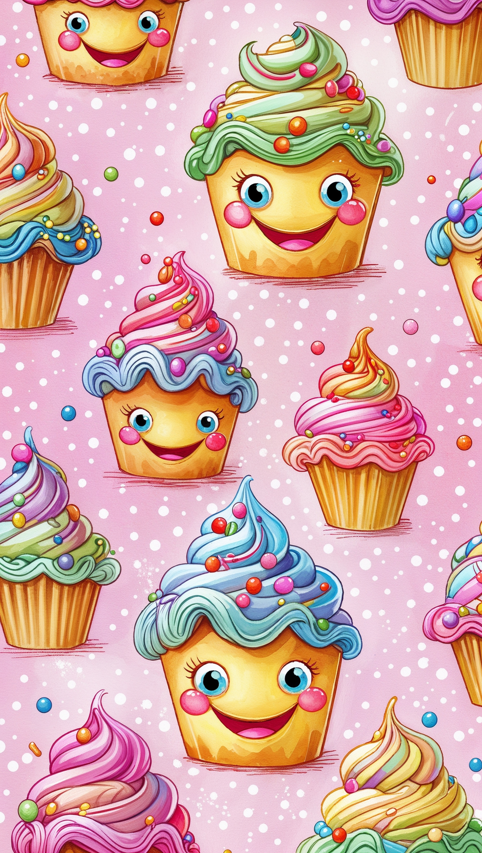 1664x2944 Cartoon cupcakes with smiling faces on soft pink polka dot background