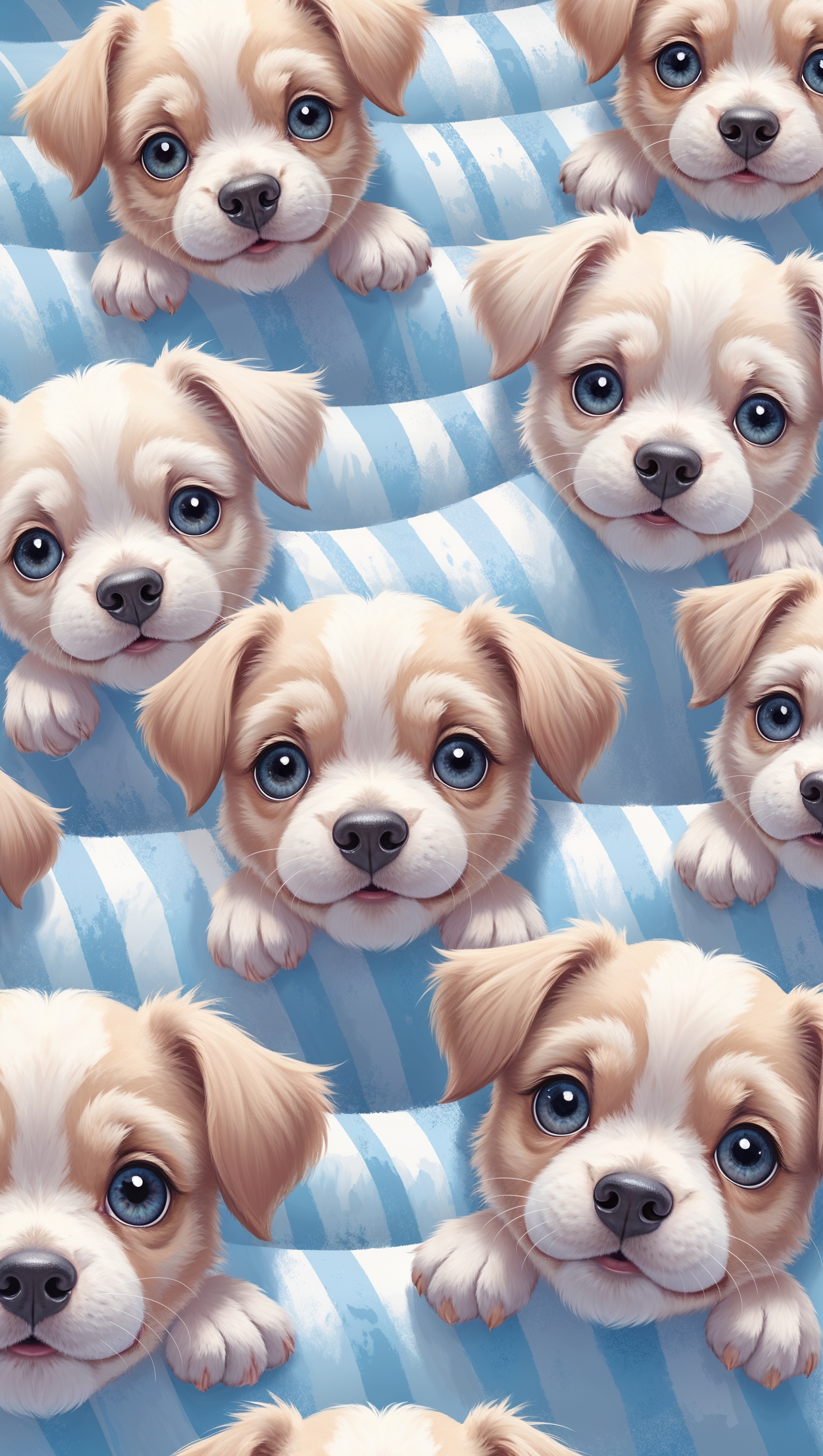 1664x2944 Cute puppy faces peeking out from pastel blue stripes background