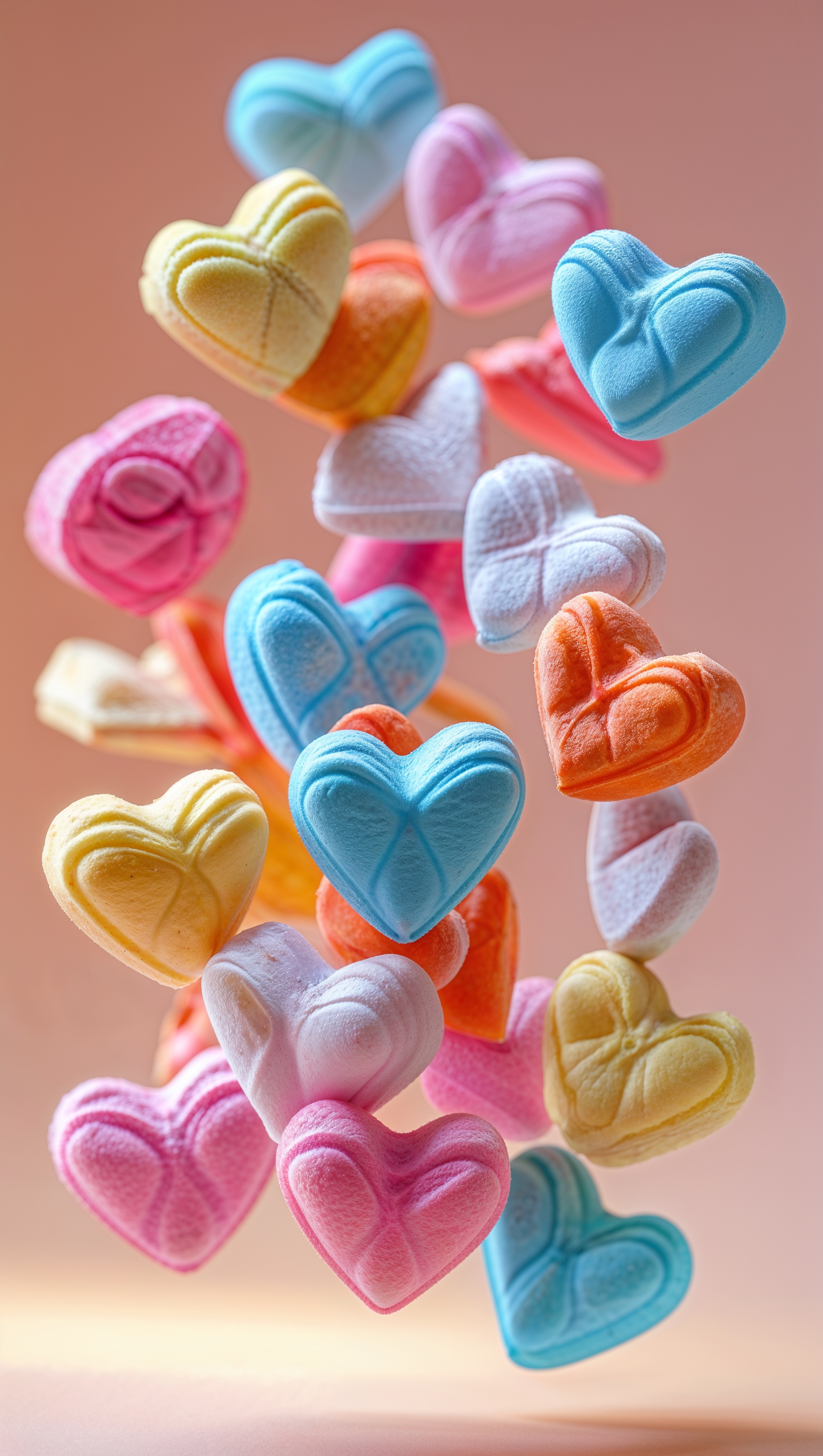 1664x2944 Colorful candy hearts floating on peach pastel background