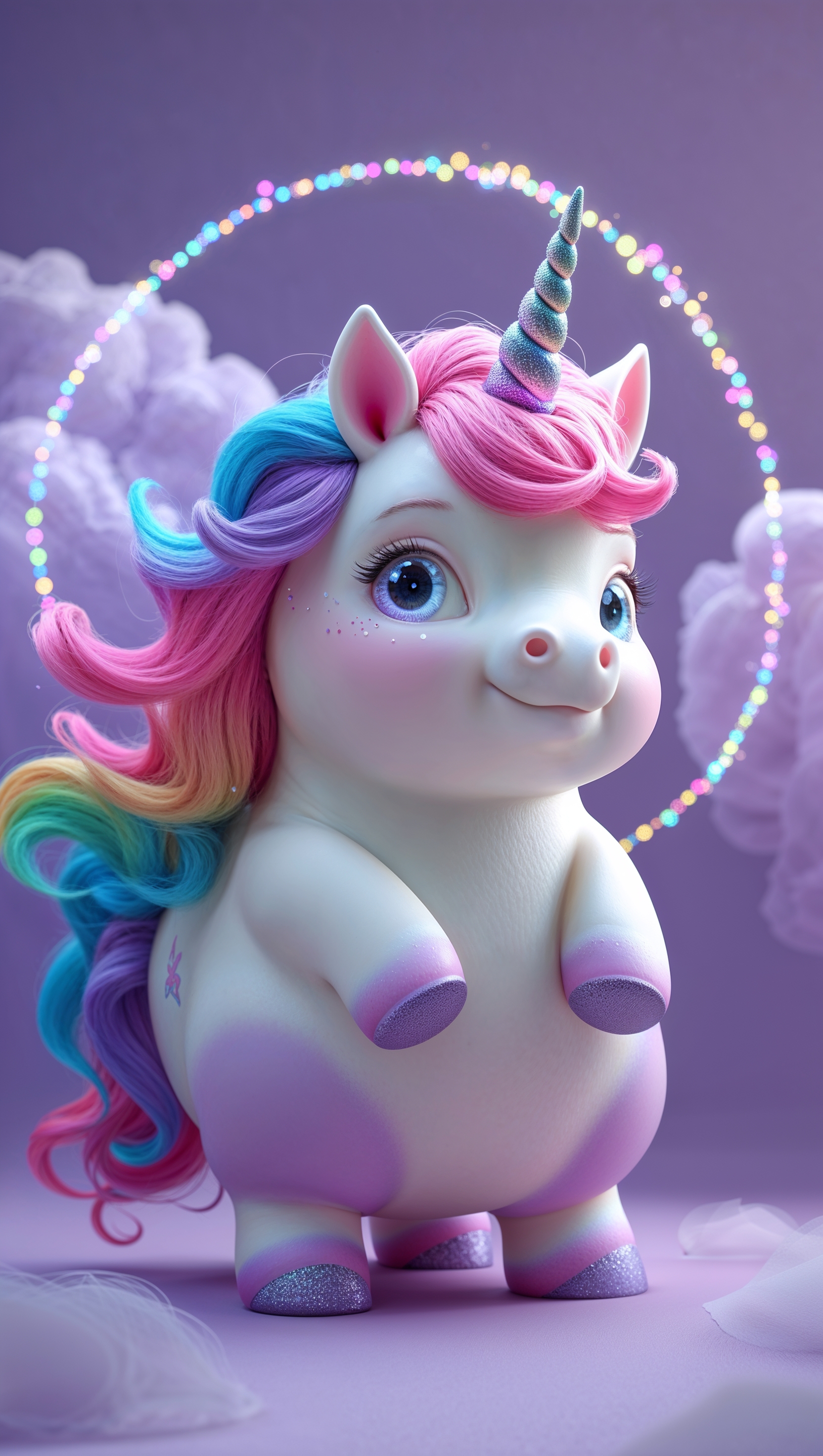 1664x2944 Chubby unicorn with rainbow mane on soft lilac background