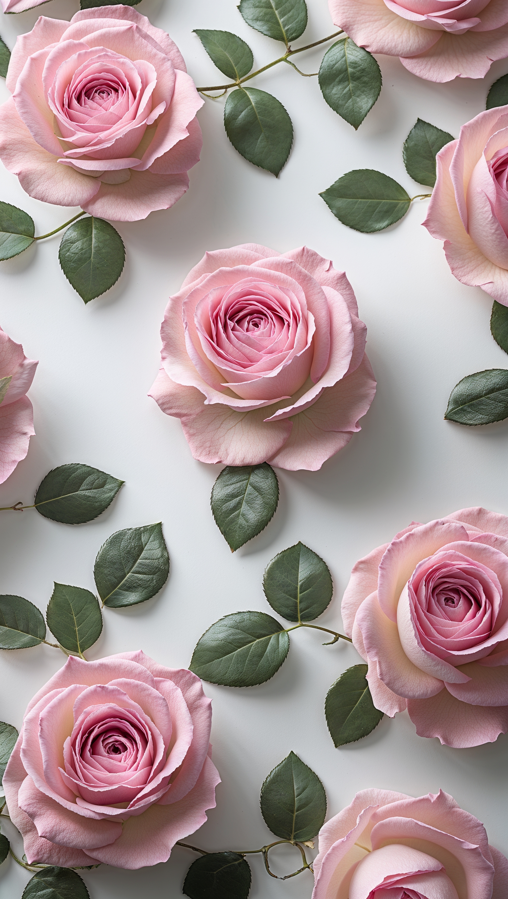 1664x2944 Pink roses and green leaves pattern on white background