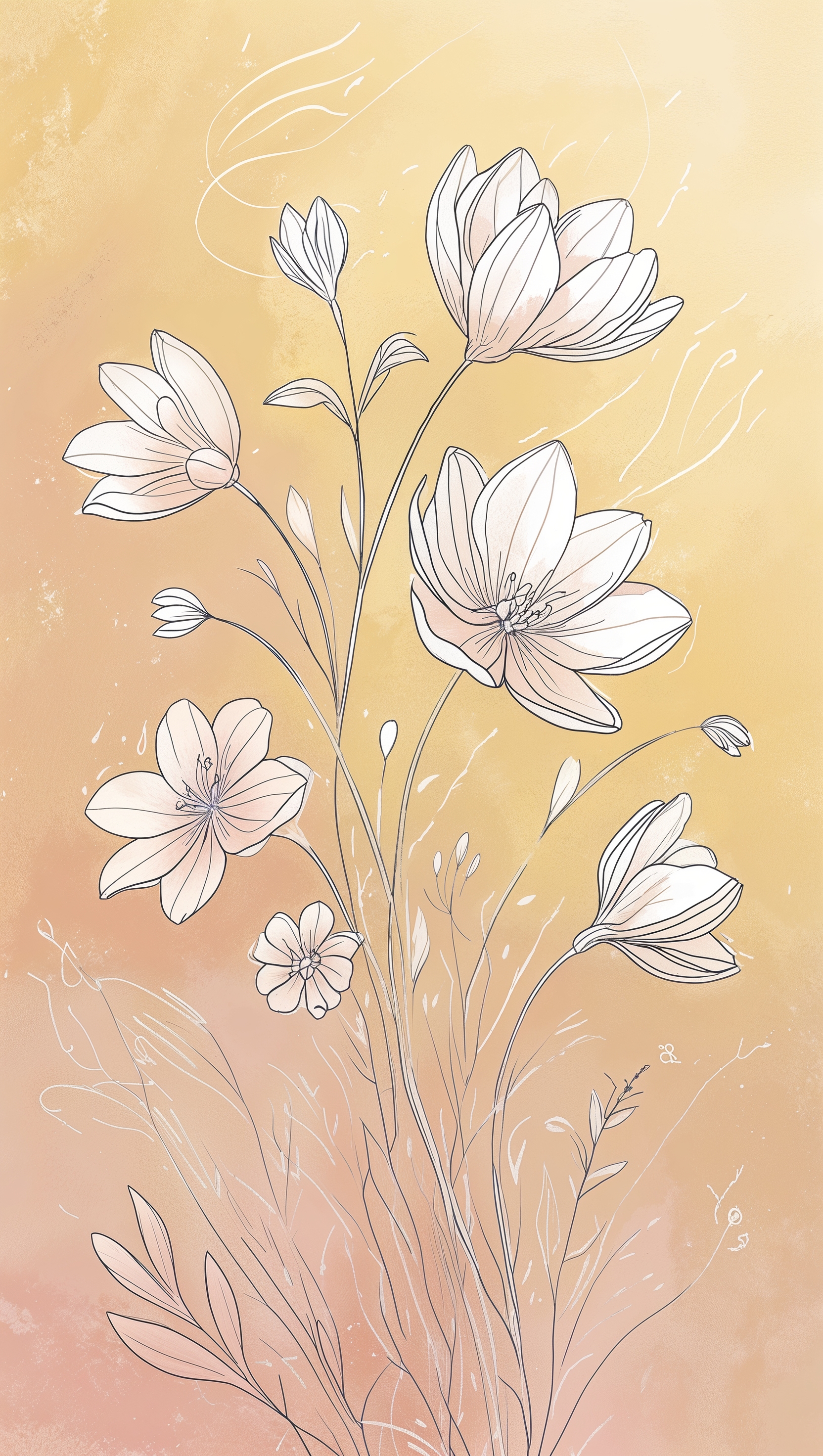 1664x2944 Simple line art of blooming flowers on pastel yellow background