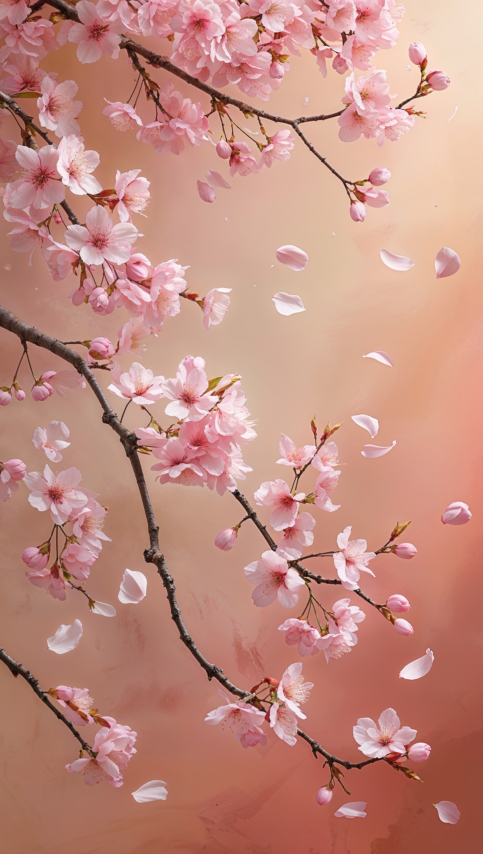 1664x2944 Cherry blossom branches with floating petals on soft peach backdrop