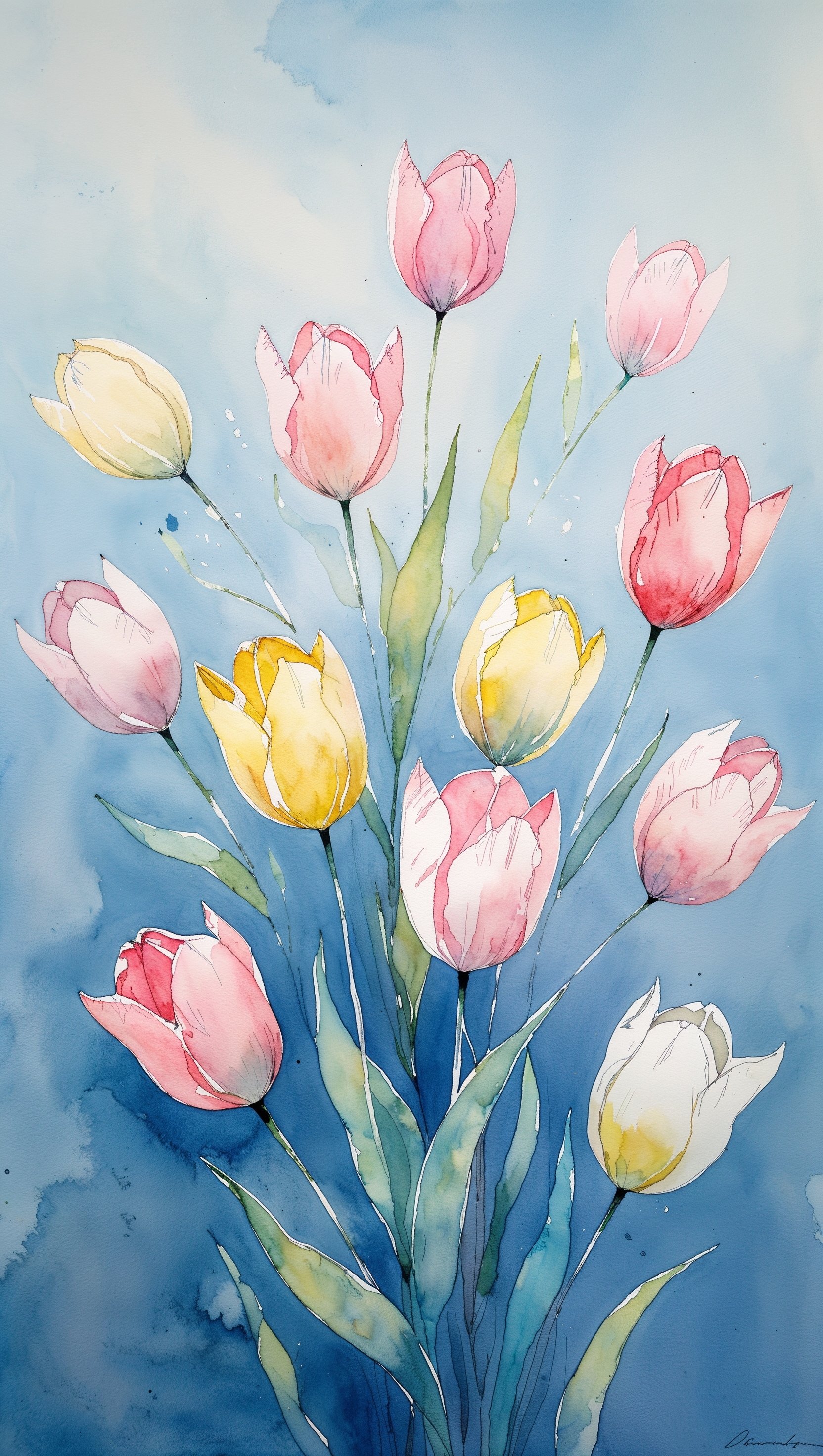 1664x2944 Watercolor tulips pattern on soft blue background
