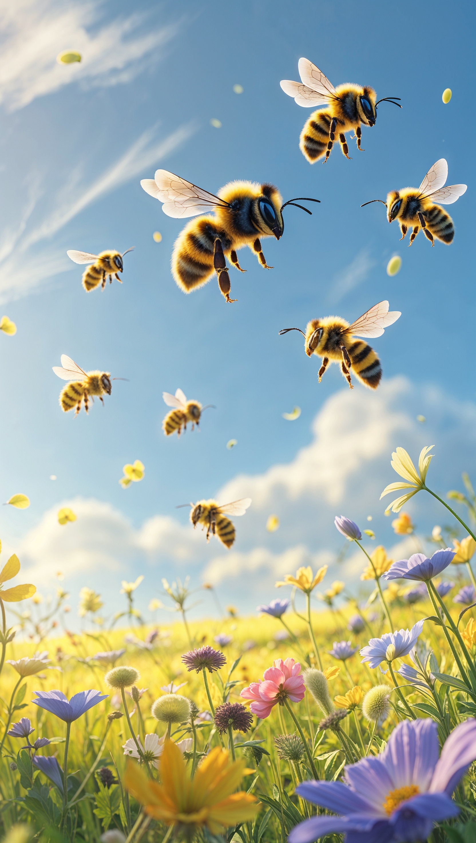 1664x2944 Cute bees flying over soft yellow floral field