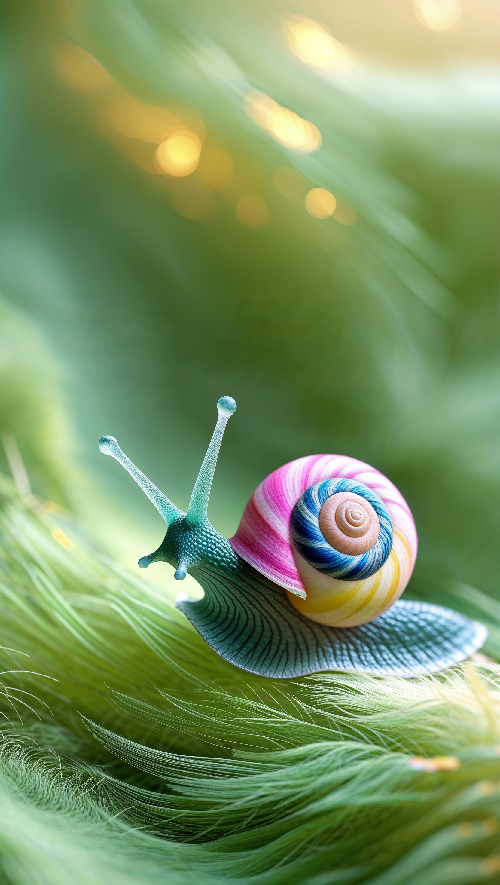 1664x2944 Whimsical snail with colorful shell crawling on soft green background