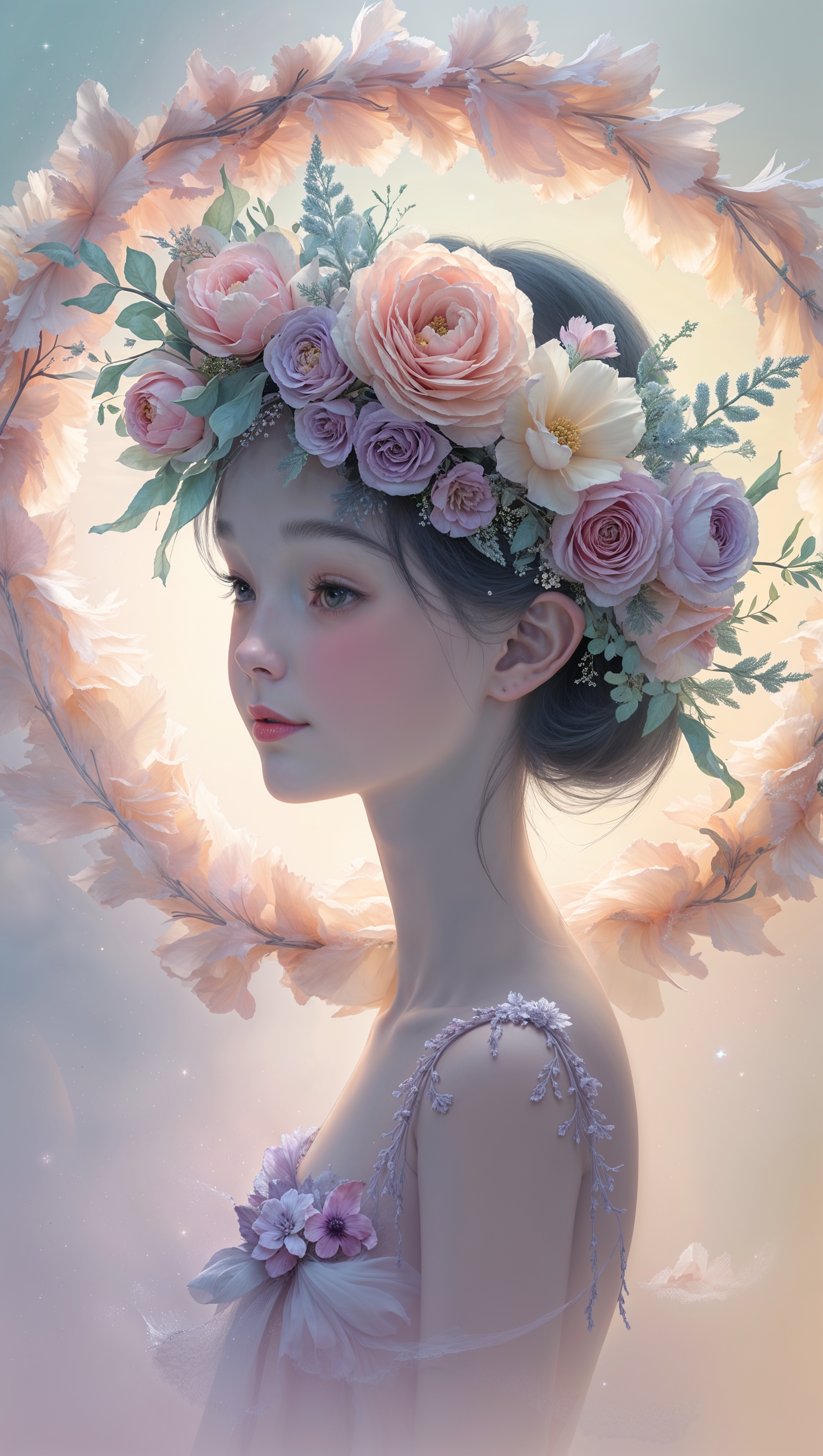 1664x2944 Elegant girl silhouette with floral crown surrounded by soft petals